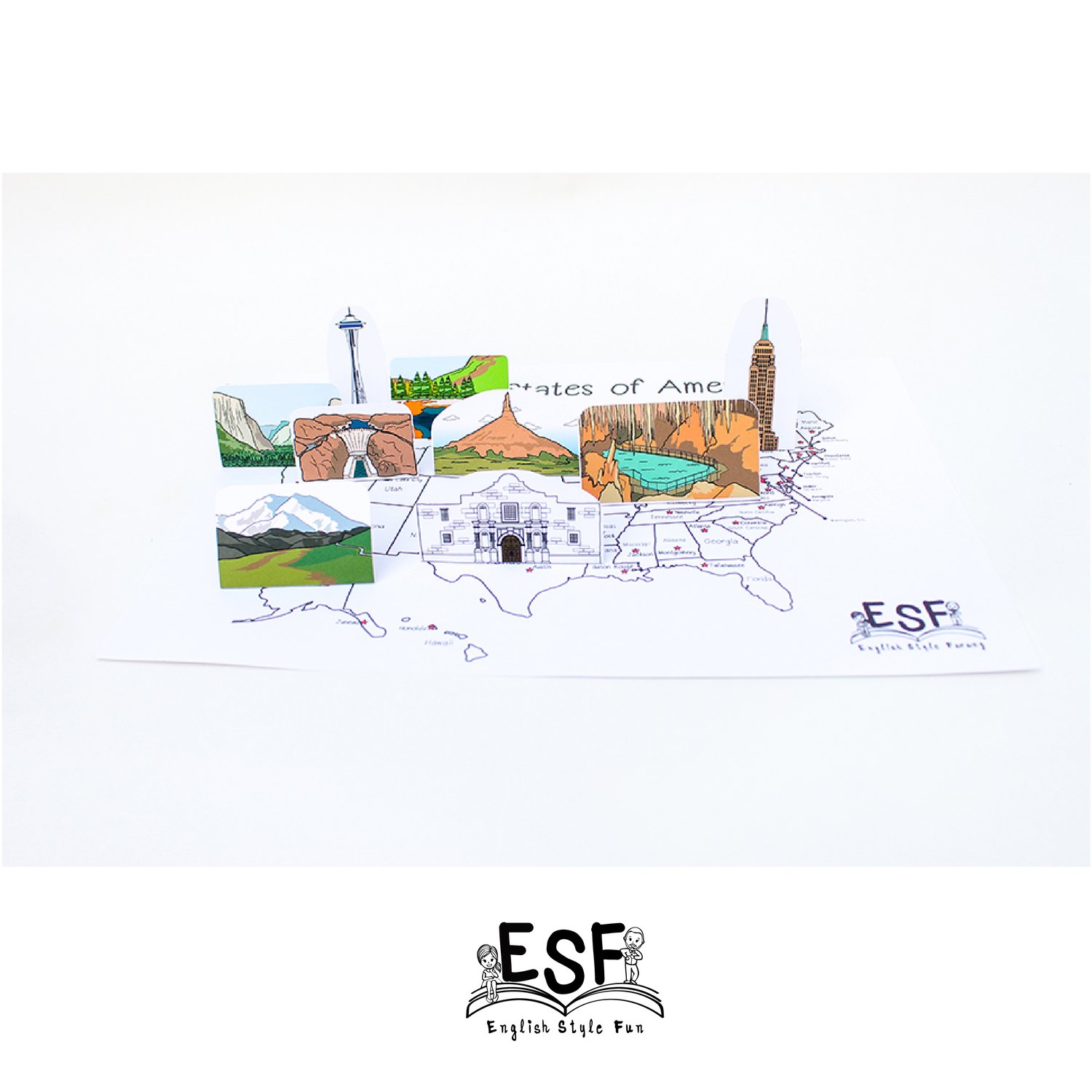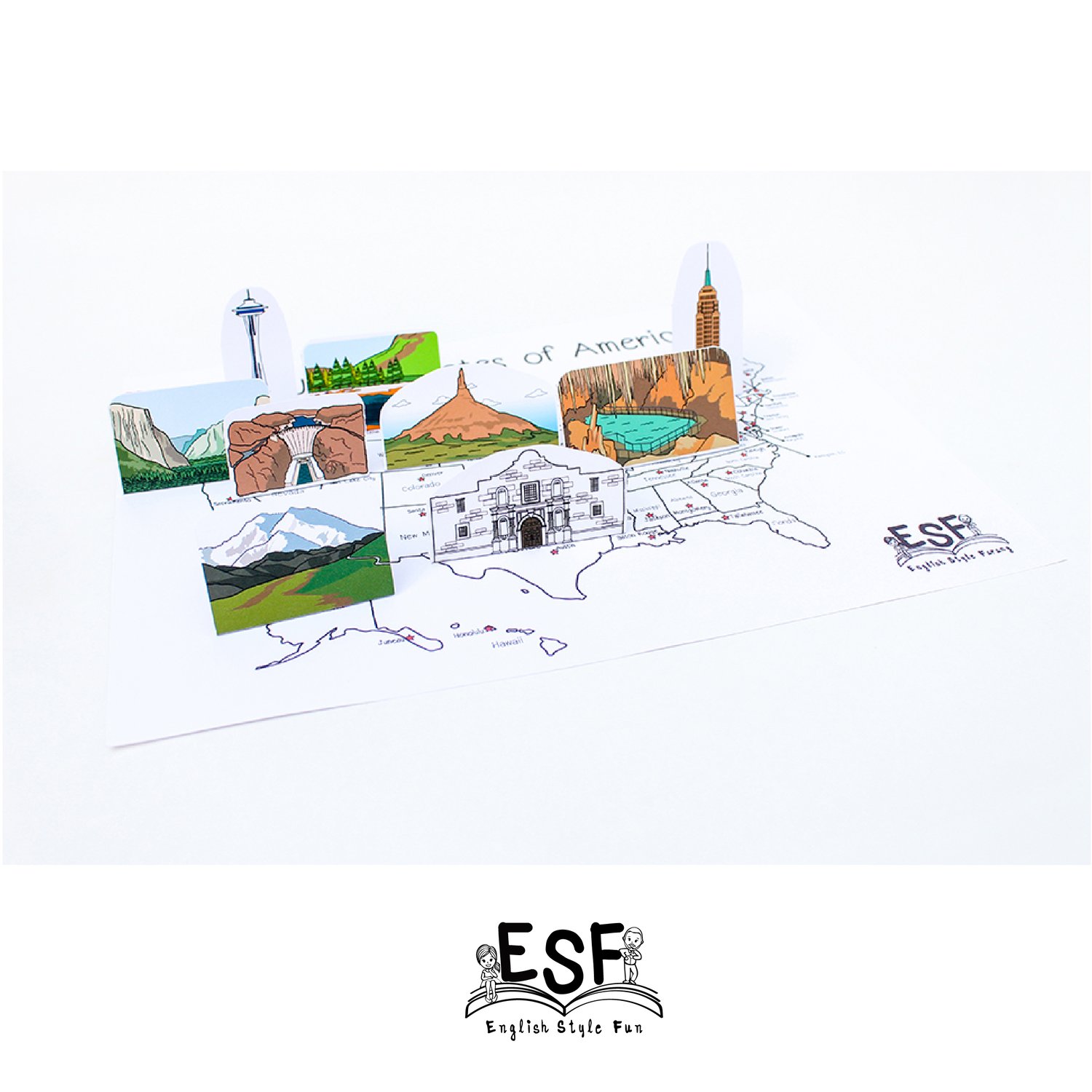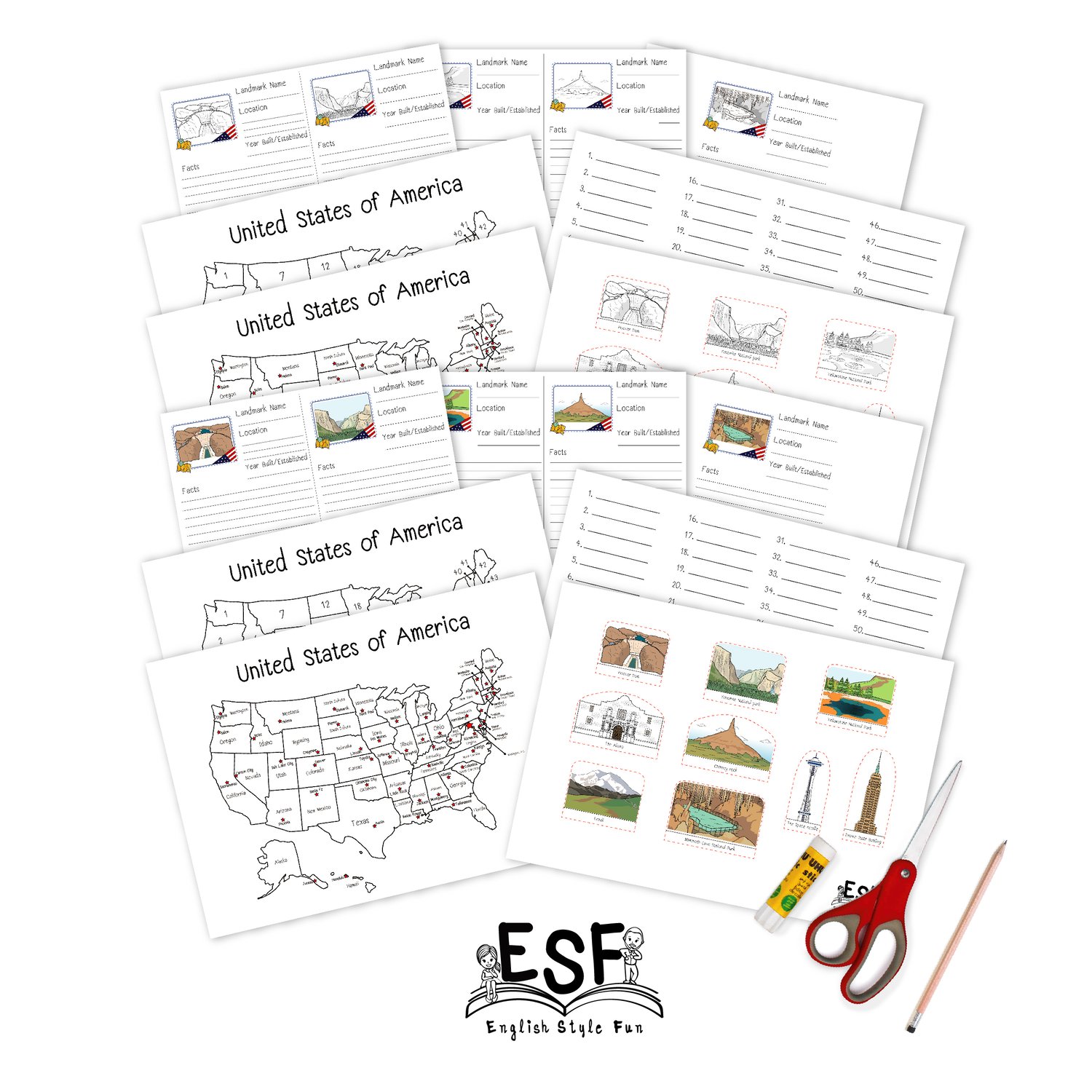 The third part is a fun activity to get your students interested in learning the location of some of the famous landmarks in the United States. Students will be required to cut out 3D pop-up images of the landmarks. You can choose to have them color the landmarks themselves or provide them with the finished colored sheet provided. They will have to place the landmarks in the correct location and glue/double side tape onto the map.