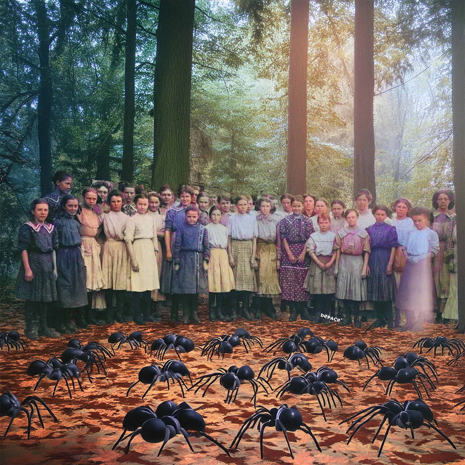 This vivid colorized rendition brings an uncanny depth to a forgotten 1925 scene—young farm girls in patched dresses, standing silent among towering trees and an army of curious fake spiders. Earthy greens, muted blues, and dusty browns breathe strange life into the eerie woodland tableau, making it feel both dreamlike and disturbingly real. It's like a page from a forgotten folktale, rediscovered and repainted with quiet dread.