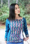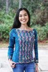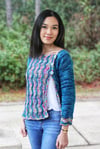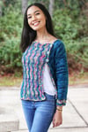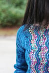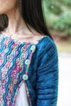 Oseleta is a drop-shoulder cardigan with asymmetrical fronts. The body of the sweater is worked sideways with feather & fan striping on the front. Beautiful speckle yarn combined with a hand-dyed semi-solid makes for a perfect match!