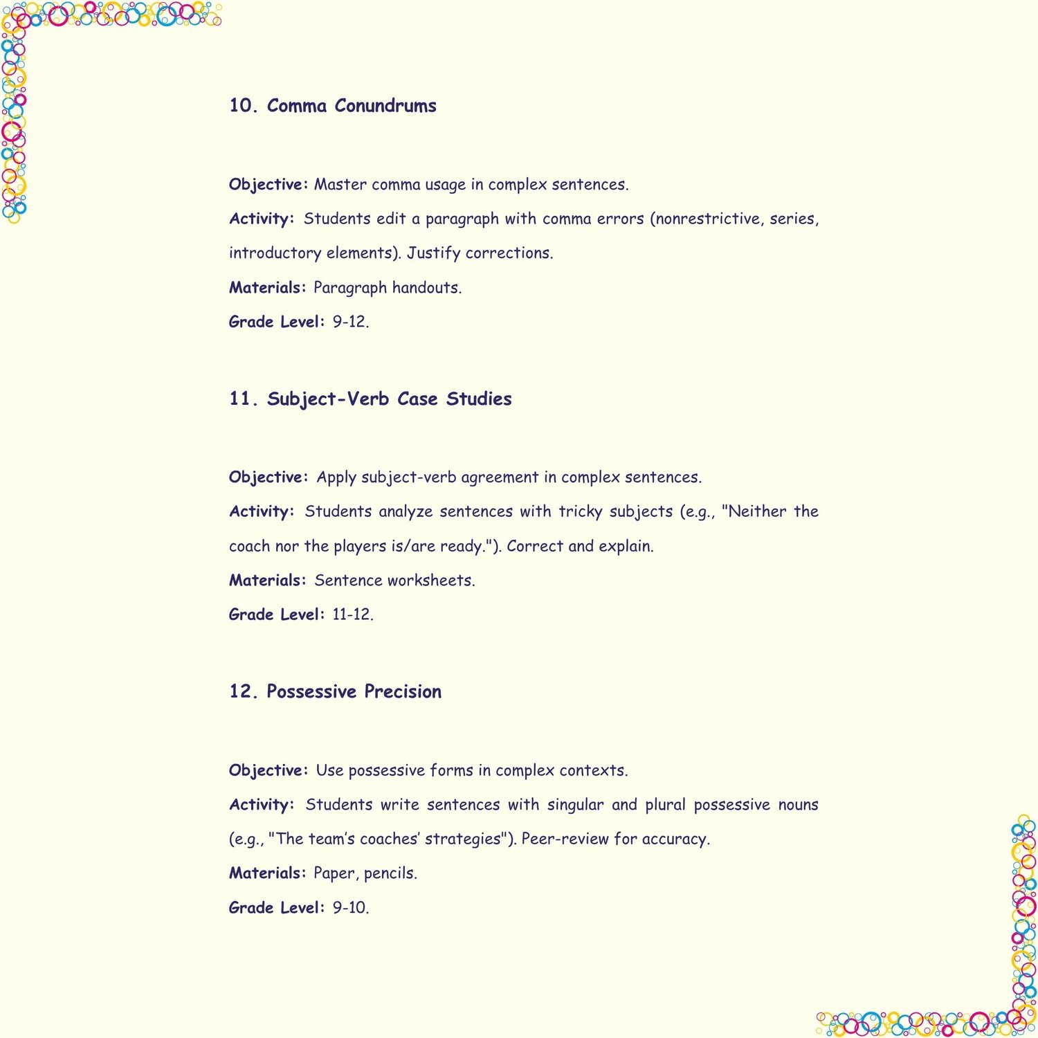 These activities are designed to engage high school students (grades 9-12) in mastering advanced grammar skills through analytical, creative, and collaborative tasks. They cover sentence structure, punctuation, style, and rhetorical grammar, with clear instructions and minimal materials.