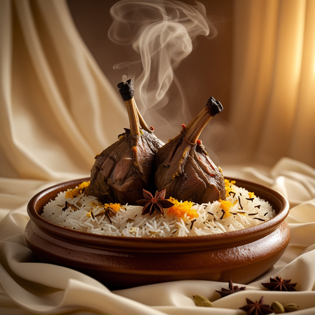 A warm and inviting professional food photography setup featuring Dum Pukht, a slow-cooked lamb dish, presented in a sealed earthen pot, placed atop a bed of aromatic saffron-infused rice, garnished with whole cardamom, star anise, and cloves, against a soft, creamy background that evokes a sense of comfort and luxury, with a hint of warm steam rising from the dish, bathed in warm, golden indoor light, emphasizing the rich flavors and aromas of the traditional Indian cuisine, with a shallow depth of field, blurring the surrounding elements, and drawing the viewer's attention to the tender, slow-cooked lamb, and the delicate arrangement of spices on the rice.