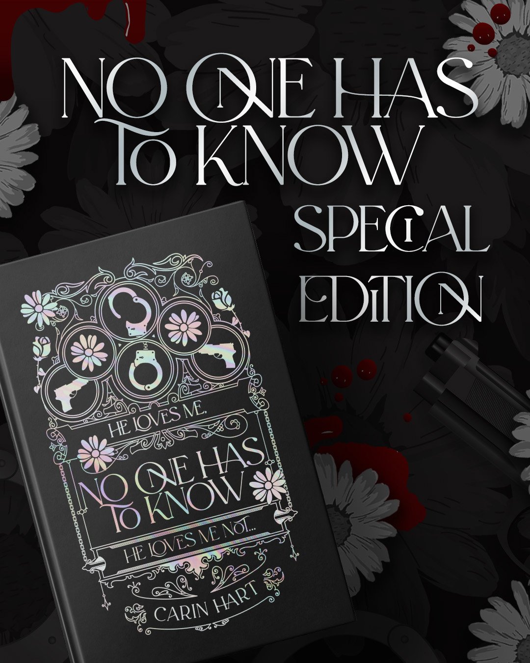 This is a signed copy of the collector's edition hardcover version of No One Has To Know by Carin Hart. It is a 5.5x8.5 trim and has a holographic foiled cover, illustrated end pages, brand new interior formatting, and sprayed edges.