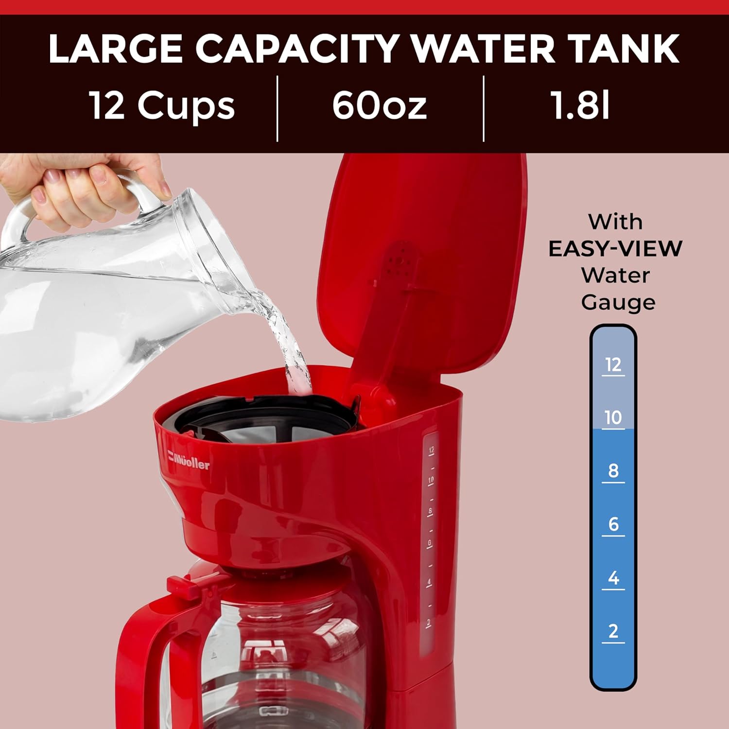 MUELLER HOME 12-Cup Red Coffee Maker – Borosilicate Carafe, Auto-Off, Reusable Filter, Anti-Drip, Keep-Warm Function