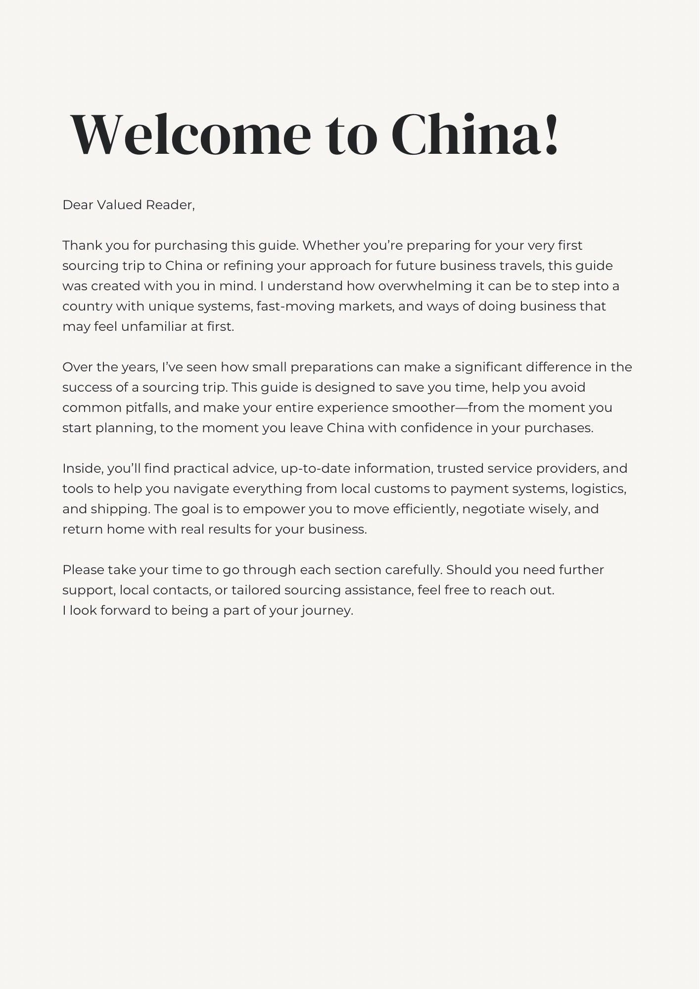 Planning a sourcing trip to China can be overwhelming—especially if you’re not familiar with local systems, payment methods, cultural expectations, or the fast pace of wholesale markets. This comprehensive 29 page Handbook is your step-by-step guide to confidently navigating your buying trip, managing your logistics, and making the most of your time in China.