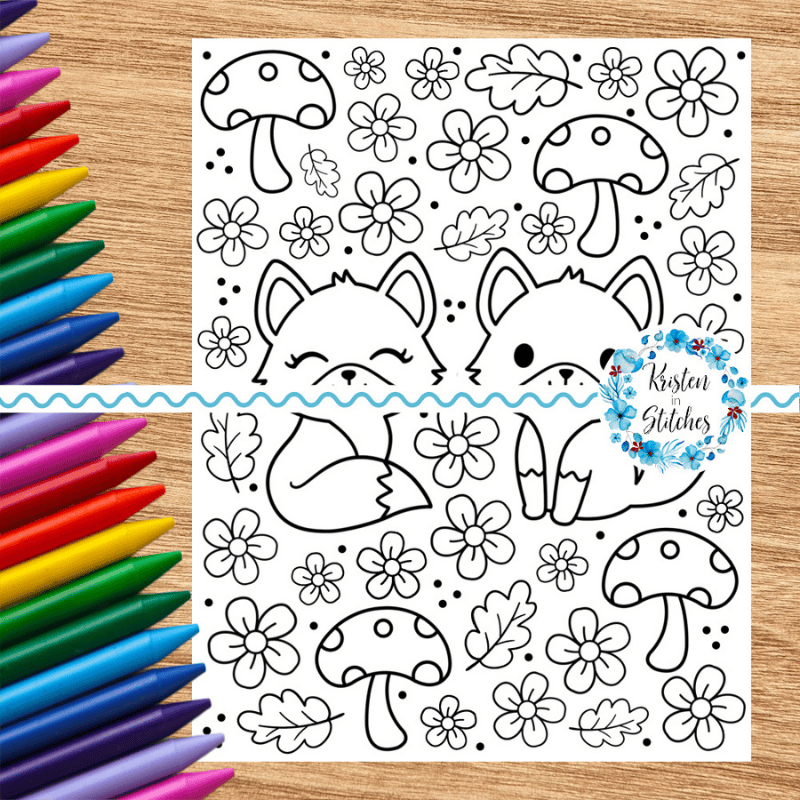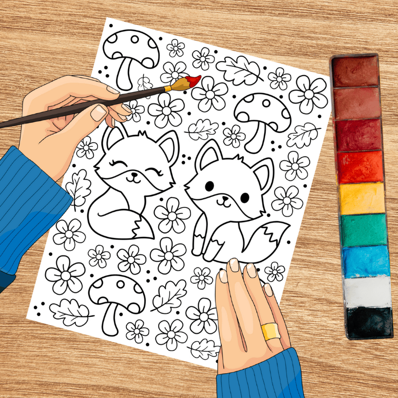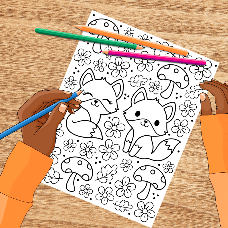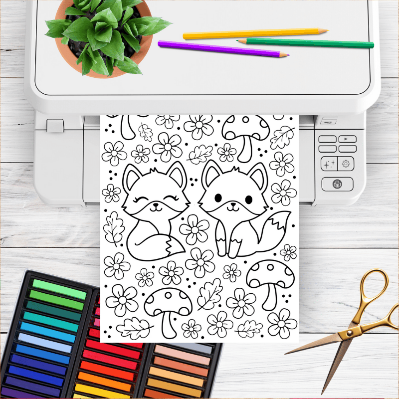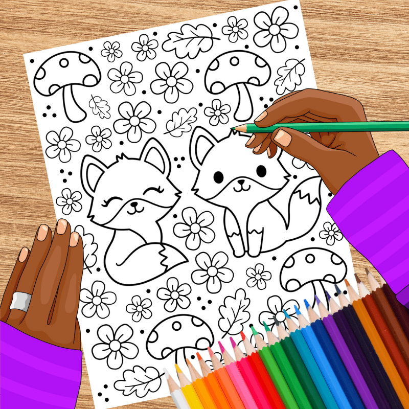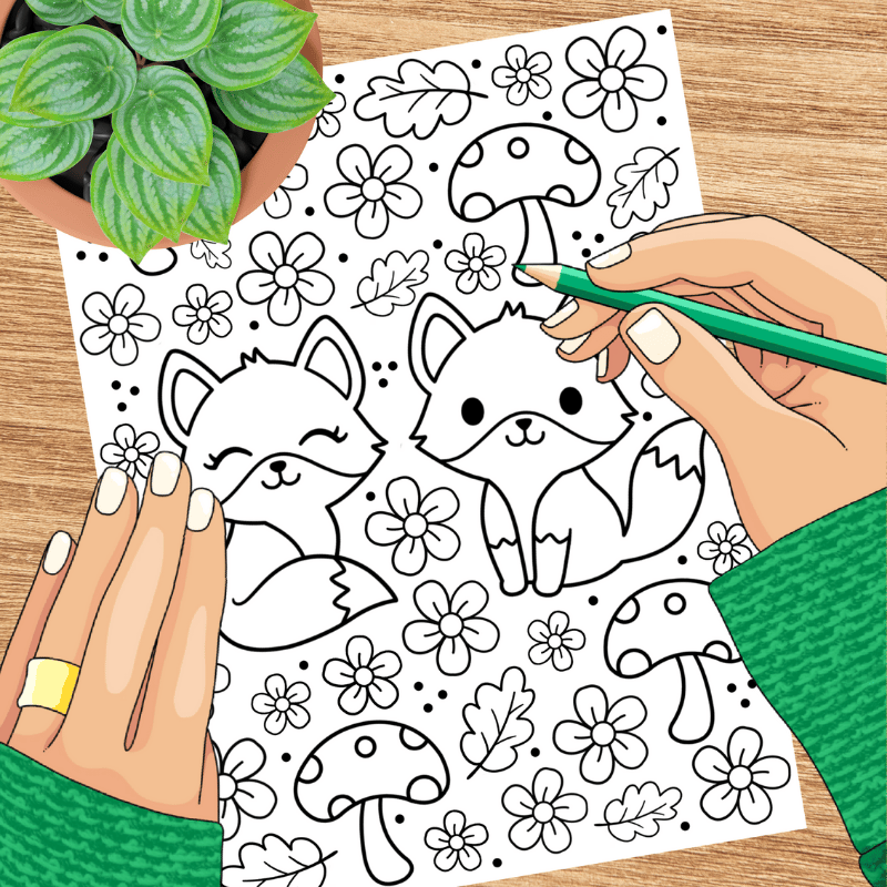 Fox Friends Coloring Page, Printable 8.5x11 Paper, PDF & PNG File, Woodland Animals and Mushrooms