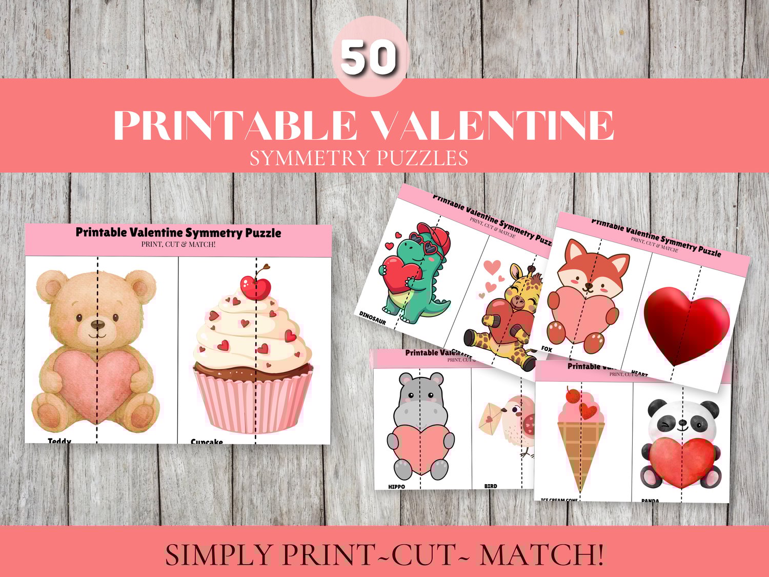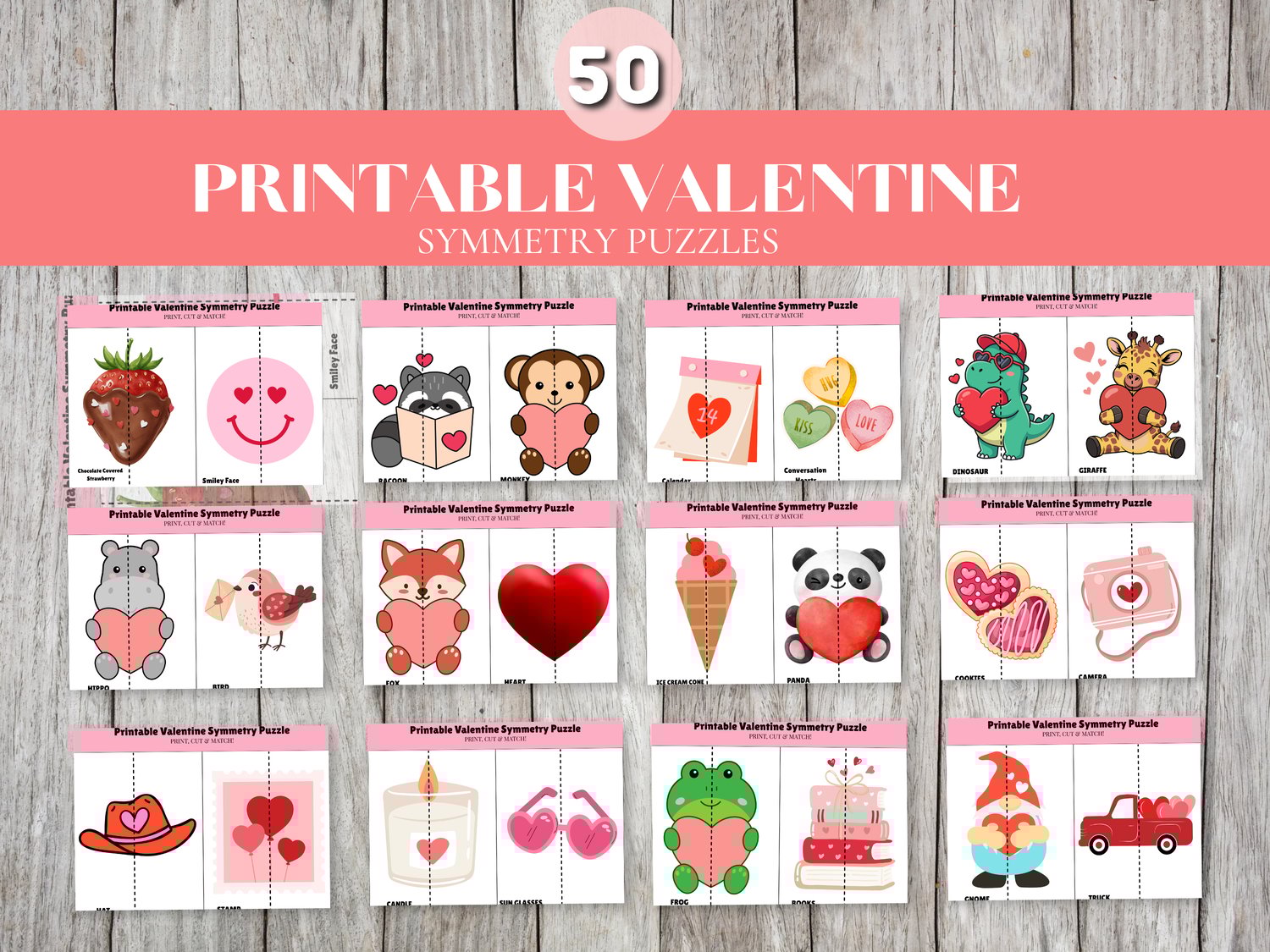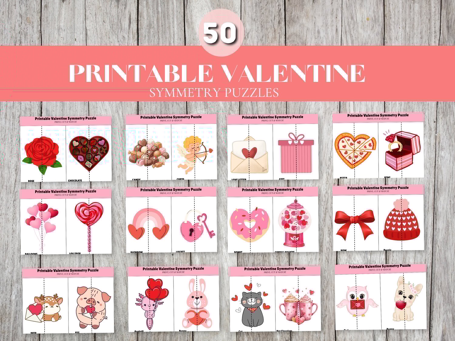 Includes 25 Valentine-themed symmetry puzzles. Simply print, cut, and match. Perfect for preschool, kindergarten, homeschool, and classroom Valentine activities. Instant PDF download.