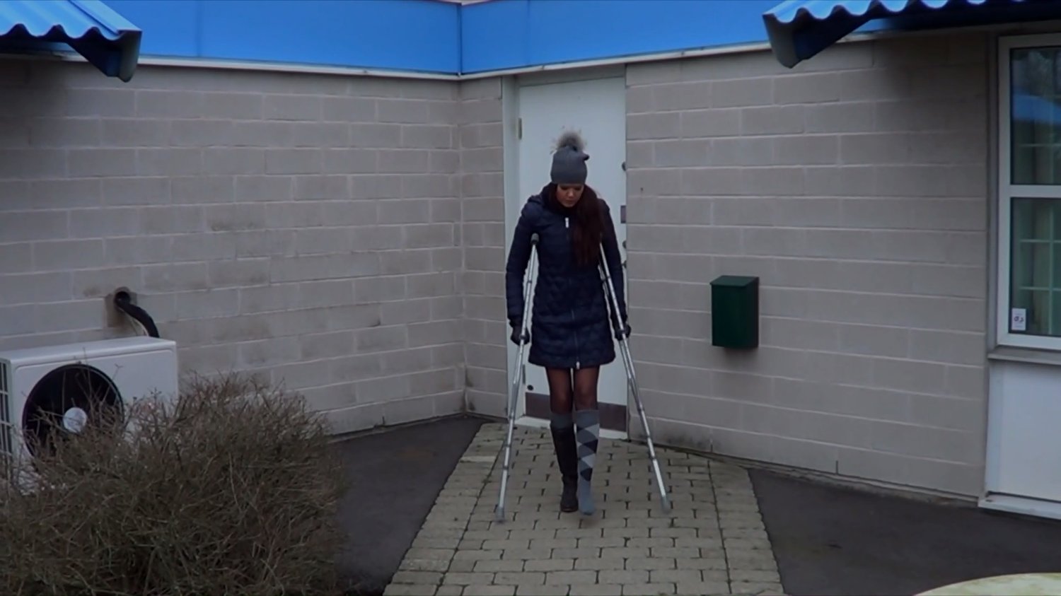 Midnight crutch away from her work with her underarm crutches.Her left hurt foot is covered by a knee high sock.we follow Midnight when she crutch along the streets.