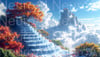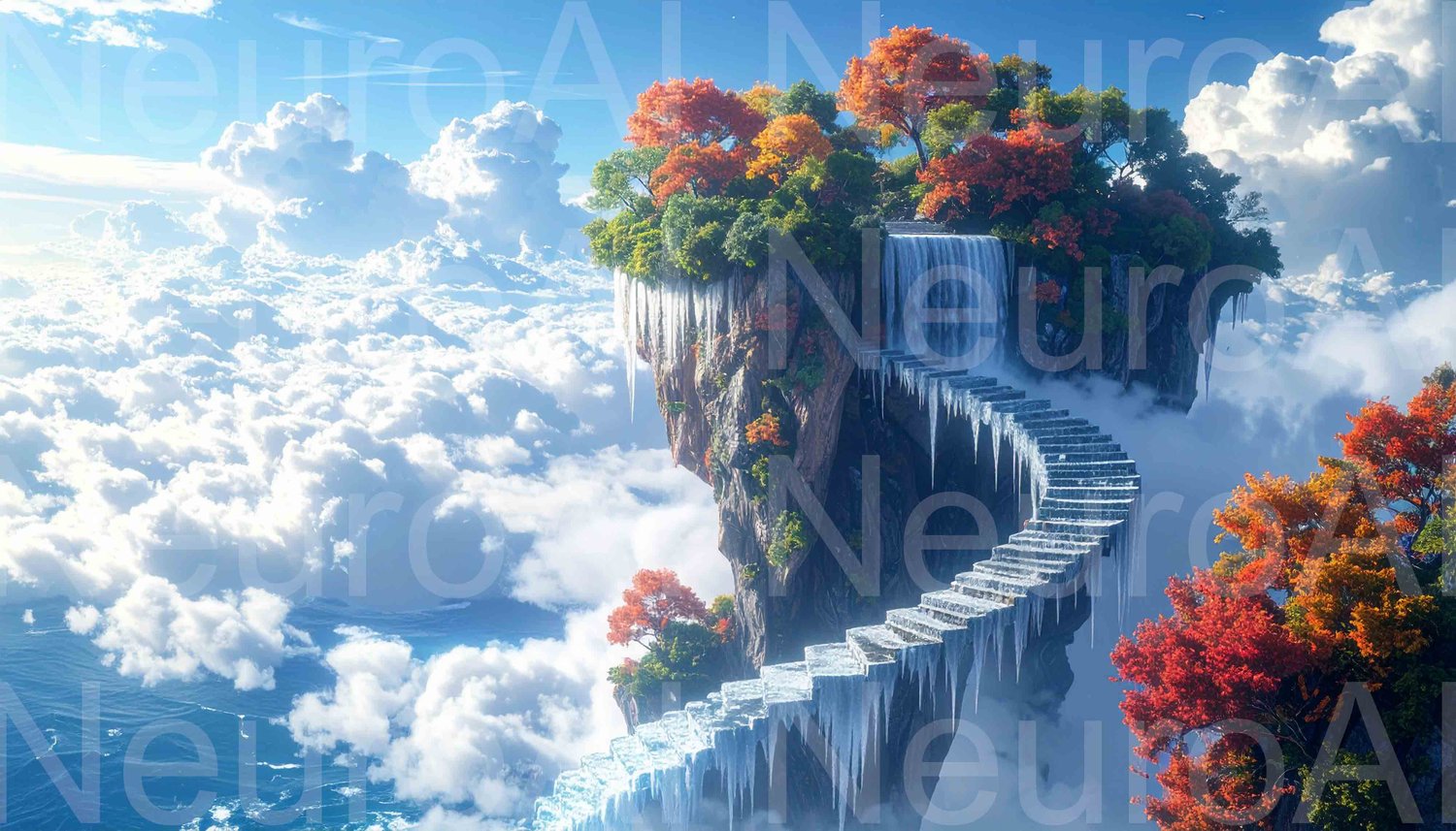 Magical waterfall staircase leading to a majestic mountain paradise