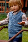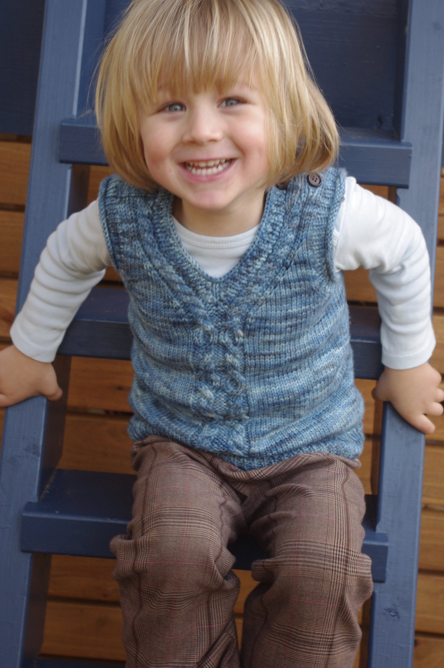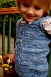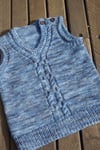 This little vest captures the essence of the Little Red’s surprise and resulting questions. Look closely at the cable and with a bit of imagination, you may just see those big eyes and perhaps even those big teeth, that so puzzled Little Red. Knit top down, beginning with saddle shoulders, it is a modern version of what Granny may perhaps knit. Baby sizes feature a tab shoulder to make it easier to dress baby.
