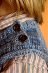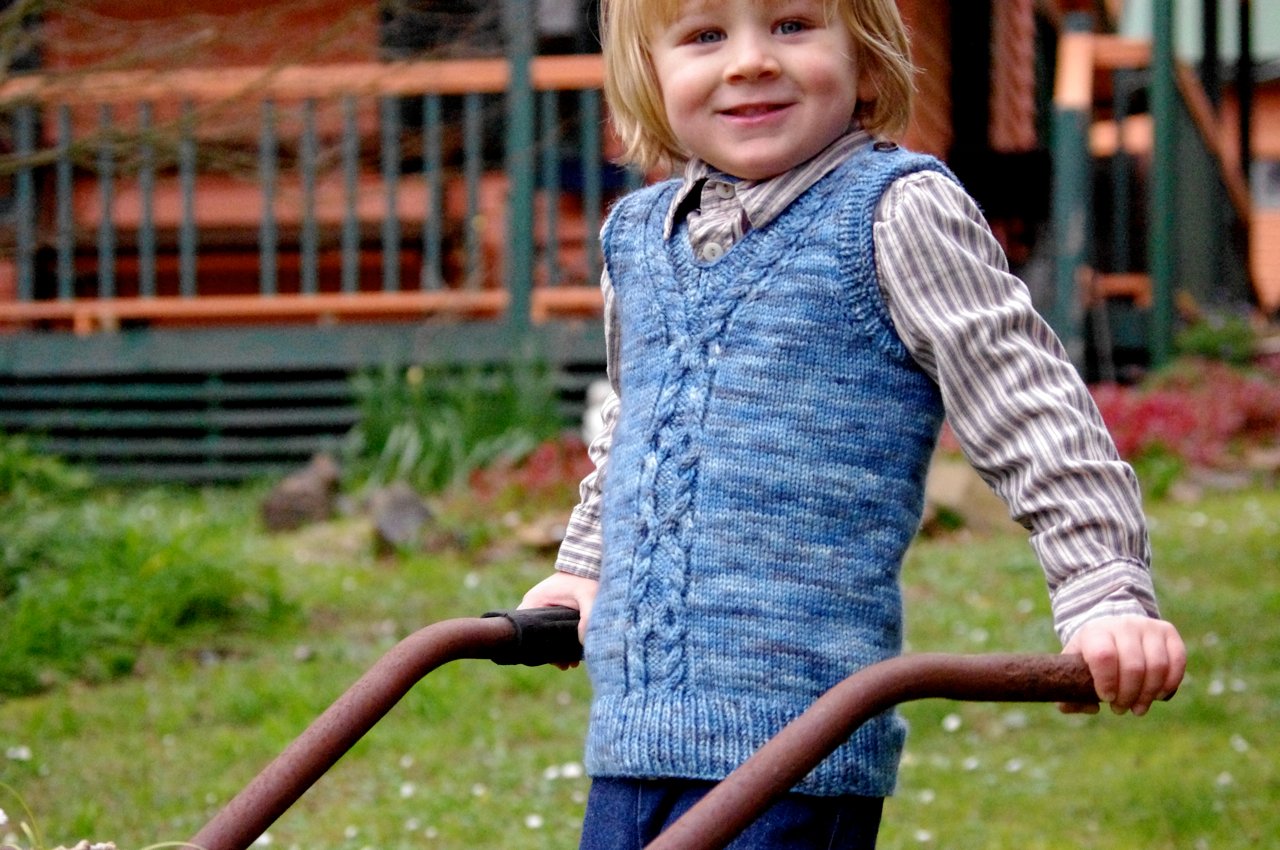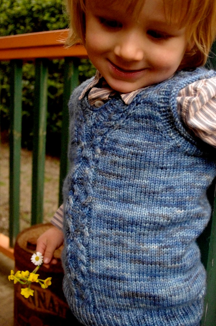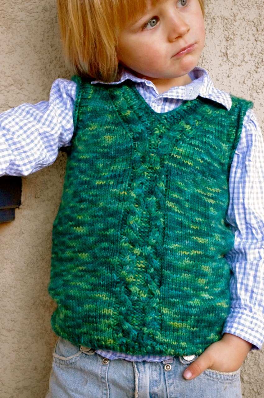 What Big Eyes You Have! uses a saddle shoulder construction. Cute little rectangles that serve as saddles are knit first. Stitches are then picked up along the saddles to form the front and back of the vest. The front and back are knit separately until joining for the body under the arms. The back of the shoulders are shaped subtly using short row shaping. Lastly the neckline and armholes are created by picking up stitches.