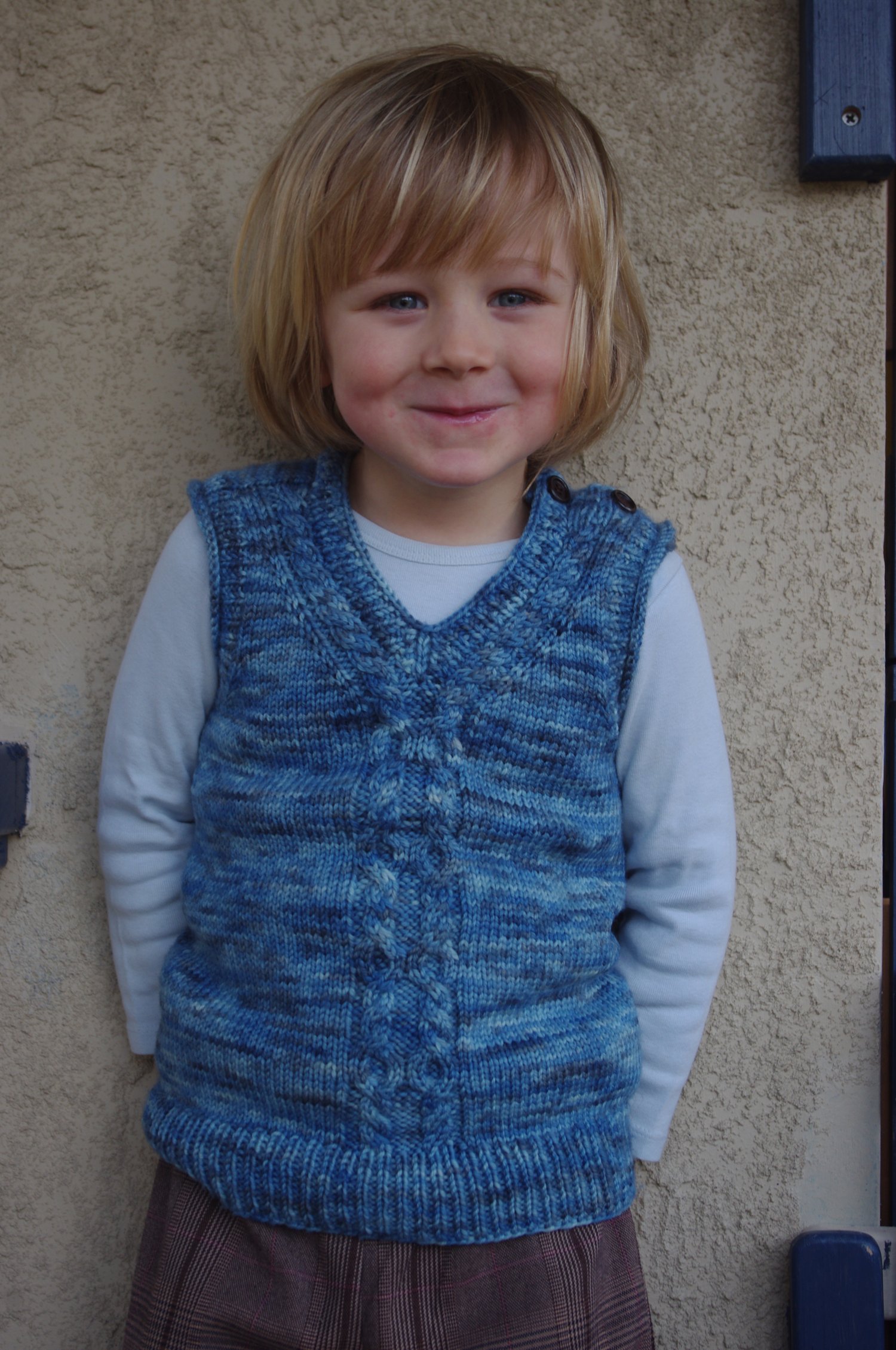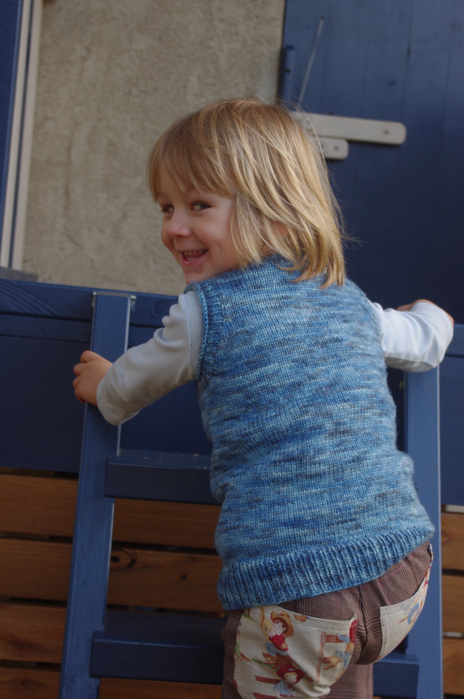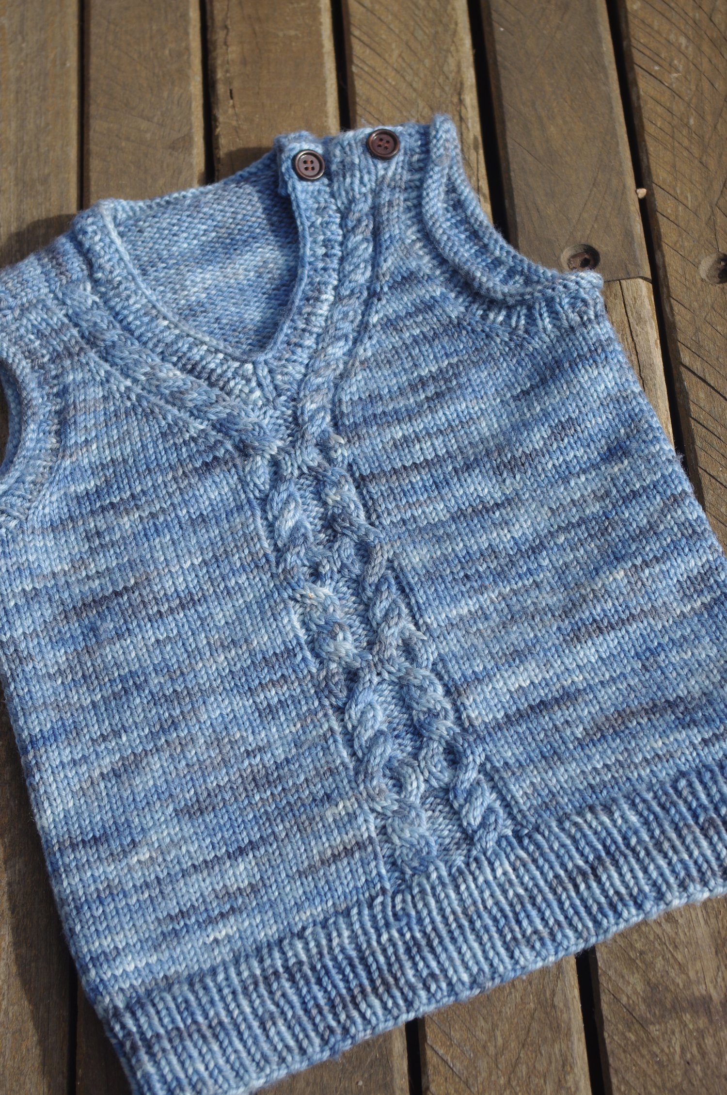 What Big Eyes You Have! uses a saddle shoulder construction. Cute little rectangles that serve as saddles are knit first. Stitches are then picked up along the saddles to form the front and back of the vest. The front and back are knit separately until joining for the body under the arms. The back of the shoulders are shaped subtly using short row shaping. Lastly the neckline and armholes are created by picking up stitches.