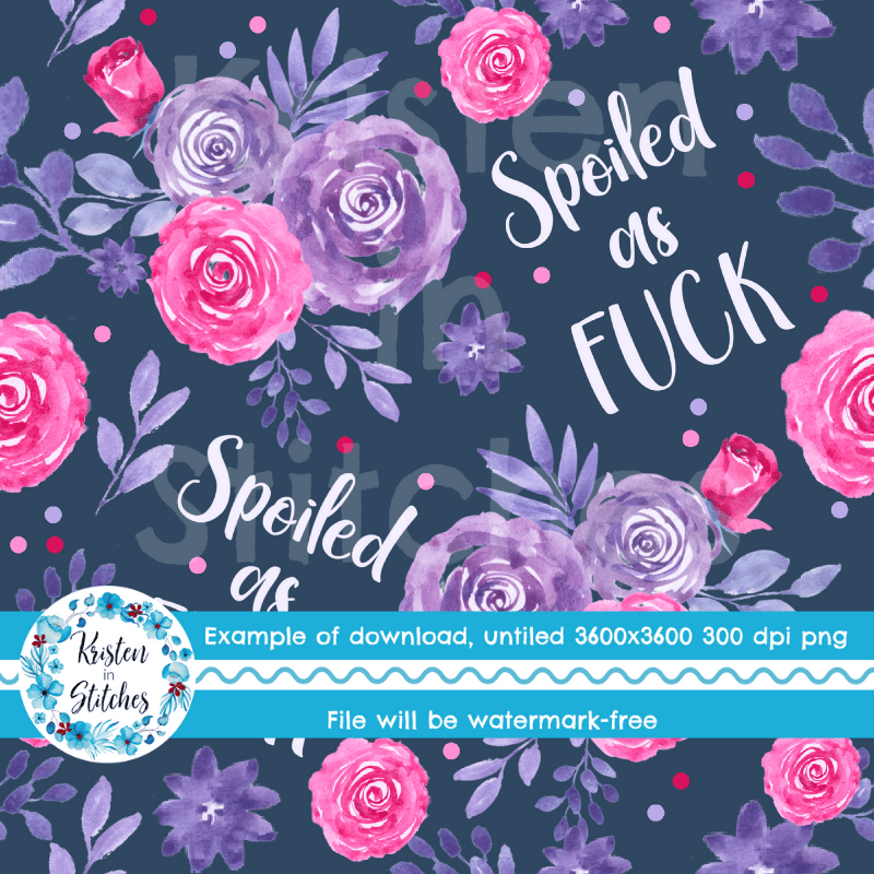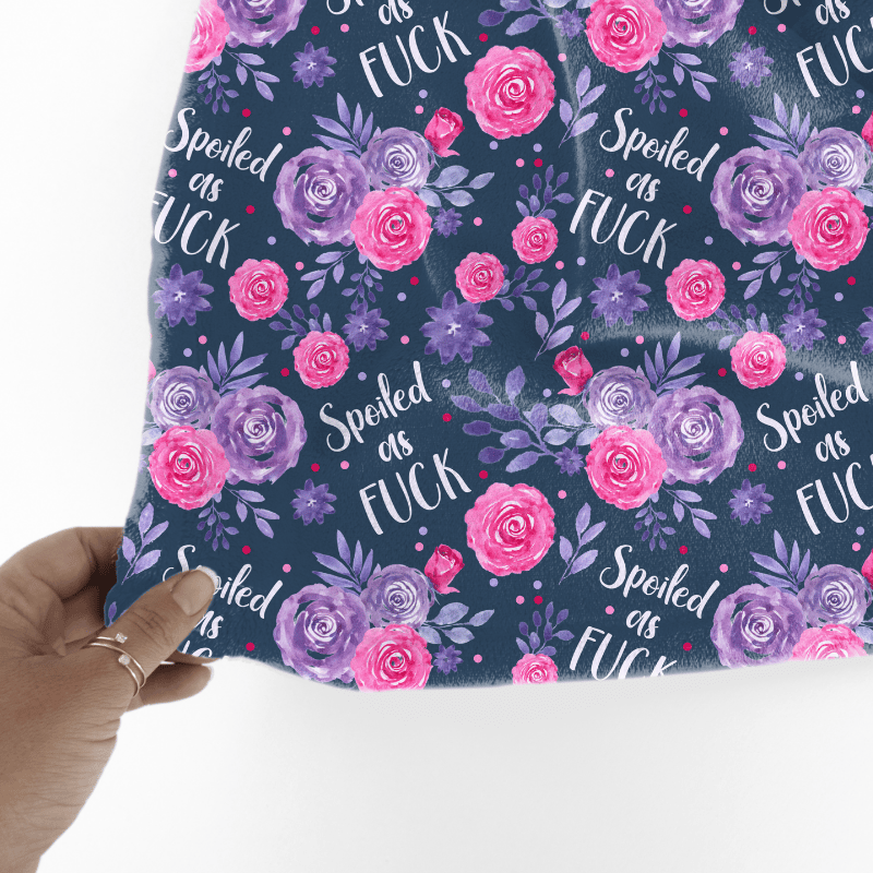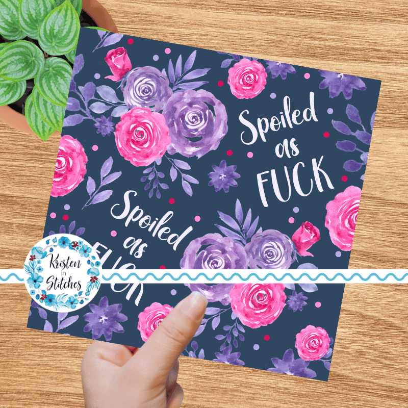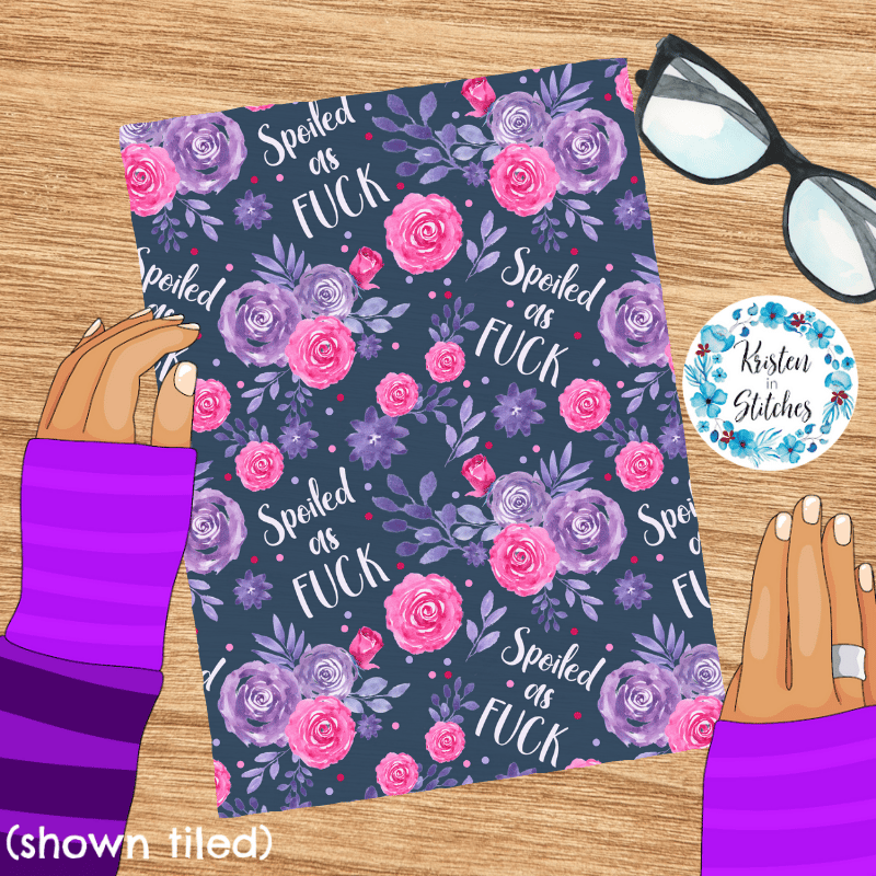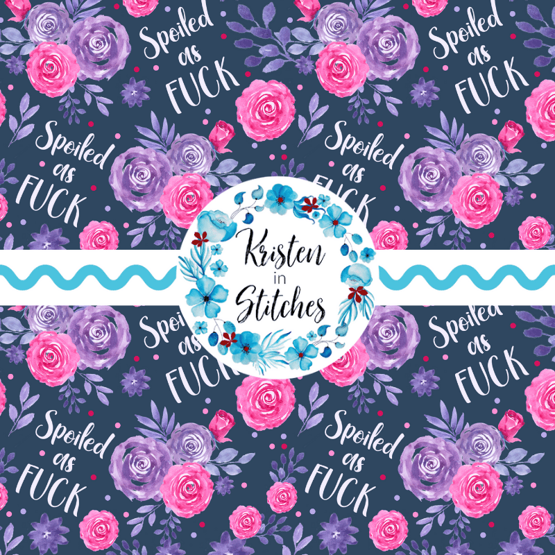 Spoiled as Fuck, with pink and purple flowers on navy.