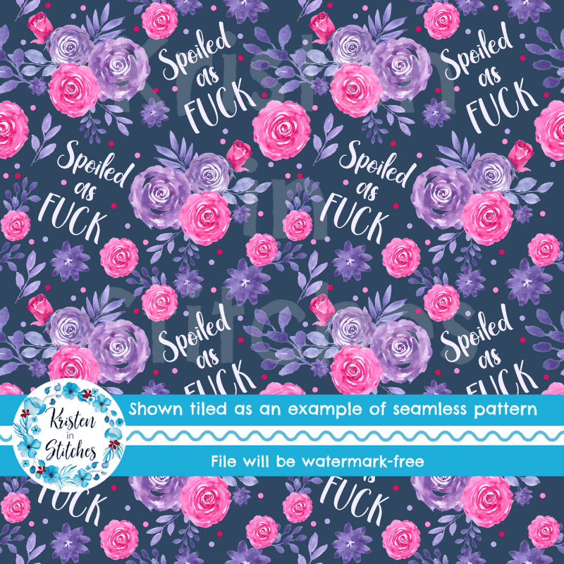 Spoiled as Fuck Swear Word Floral Seamless Pattern, Pretty Profanities, Pink and Purple on Navy