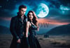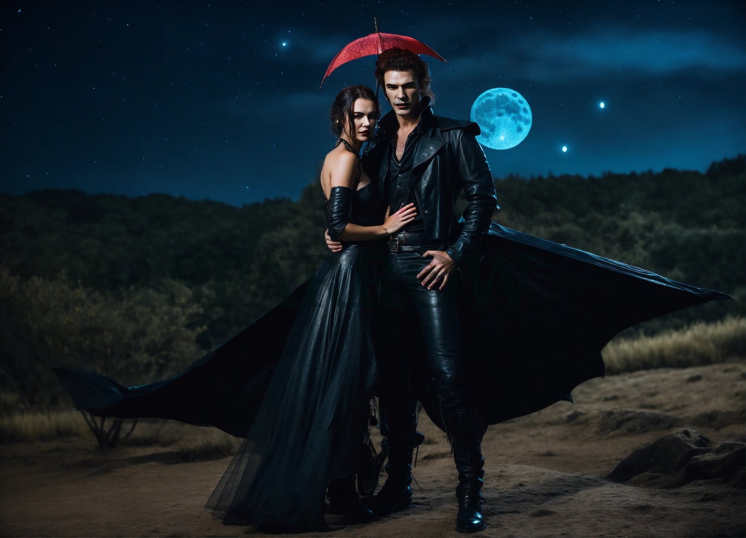 Image of a couple embracing in the forest at night with a full moon. : Paranormal romance, Love and supernatural, Fantasy couple, Ghostly love, Mystic romance, Enchanted lovers, Otherworldly passion, Supernatural relationship, Magical embrace, Eerie romance, Ethereal couple, Haunting love, Dark fantasy love, Mysterious connection, Ghostly soulmates, Fantasy love story, Paranormal passion, Enigmatic lovers, Mystic bonding, Spooky romance, Stock image, High-resolution, Fantasy background, Romantic scene, Love concept, Storytelling, Digital art, AI, Creative design, Surreal atmosphere, Dreamy backdrop, Magical elements, Beautiful couple, Artistic composition, Commercial use, Atmospheric lighting, Mystical setting, Relationship concept, Emotive characters, Fictional love, Editorial use, Advertising, Marketing, Social media, Website design, Blog post, Article illustration, Book cover, Magazine layout, Poster design, Brochure, Presentation, E-book, Print material, Digital publication, Educational materials, Background image, Wallpaper, Conceptual art, Storytelling Wolf shifter couple, Full moon background, Romantic moonlit scene, Alpha wolf pack, Fated mates embrace, Shapeshifter love, Enchanted forest setting, Moonlit meadow, Mystical bond, Howling wolves, Silhouetted trees, Nighttime romance, Alpha male and female, Lycanthropy fantasy, Supernatural passion, Mystic atmosphere, Moonlit wilderness, Fierce connection imagery, Romantic wolf eyes, Moonlit path, young adult romance, YA, PNR, paranormal romance, vampire, vampire hunter, Little Red Riding Hood, serialized online fiction cover image, Radish, Dreame, GoodNovel, iReader, Vella, SWAG, book, author, writer, blogger, creator