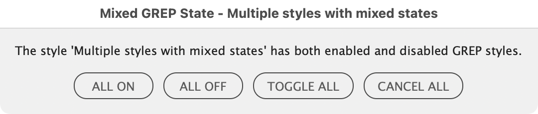 The script offers flexible options: work with the current paragraph style at your cursor, select multiple styles from a list, or process all styles in your document at once. When disabling GREP styles, you can choose between adding an asterisk prefix to expressions or setting character styles to [None]. The tool intelligently handles mixed-state styles where some GREP effects are active and others aren't, giving you full control over your document's formatting.