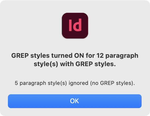 This InDesign script provides an easy way to enable or disable GREP styles within your paragraph styles. Whether you need to quickly turn off formatting effects for a clean layout or reactivate them for final output, this tool streamlines the process with a user-friendly interface.