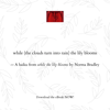 “while the lily blooms, a collection of monoku and dua by visual artist and poet Norma Bradley, is painted in the hues of wild violets, winter berries, and dogwood blossoms. These meditative moments span the life-cycle of birth, death, and everything in between. Norma’s observation of nature, be it the migrating birds or the alpenglow, reflect her inner world and the transience that is us, often connecting to the continuum of generations past. The sights, sounds, and tastes in these poems are sensorially rich, yet expressed without embellishment.”