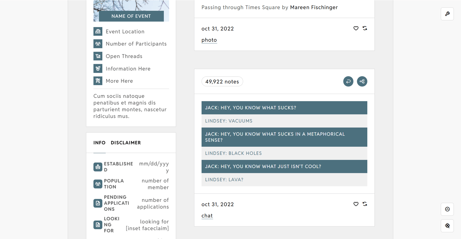 - main container: 250x300px sidebar image, blog title, blog subtitle, admins section, events section, tabs: site info section and disclaimer, 500px text posts
