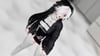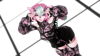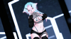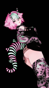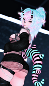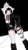 no fishnet tights, fishnet top, white dress, white pasties, tattoos, sclera black, leg warmers, ponytail, belt,