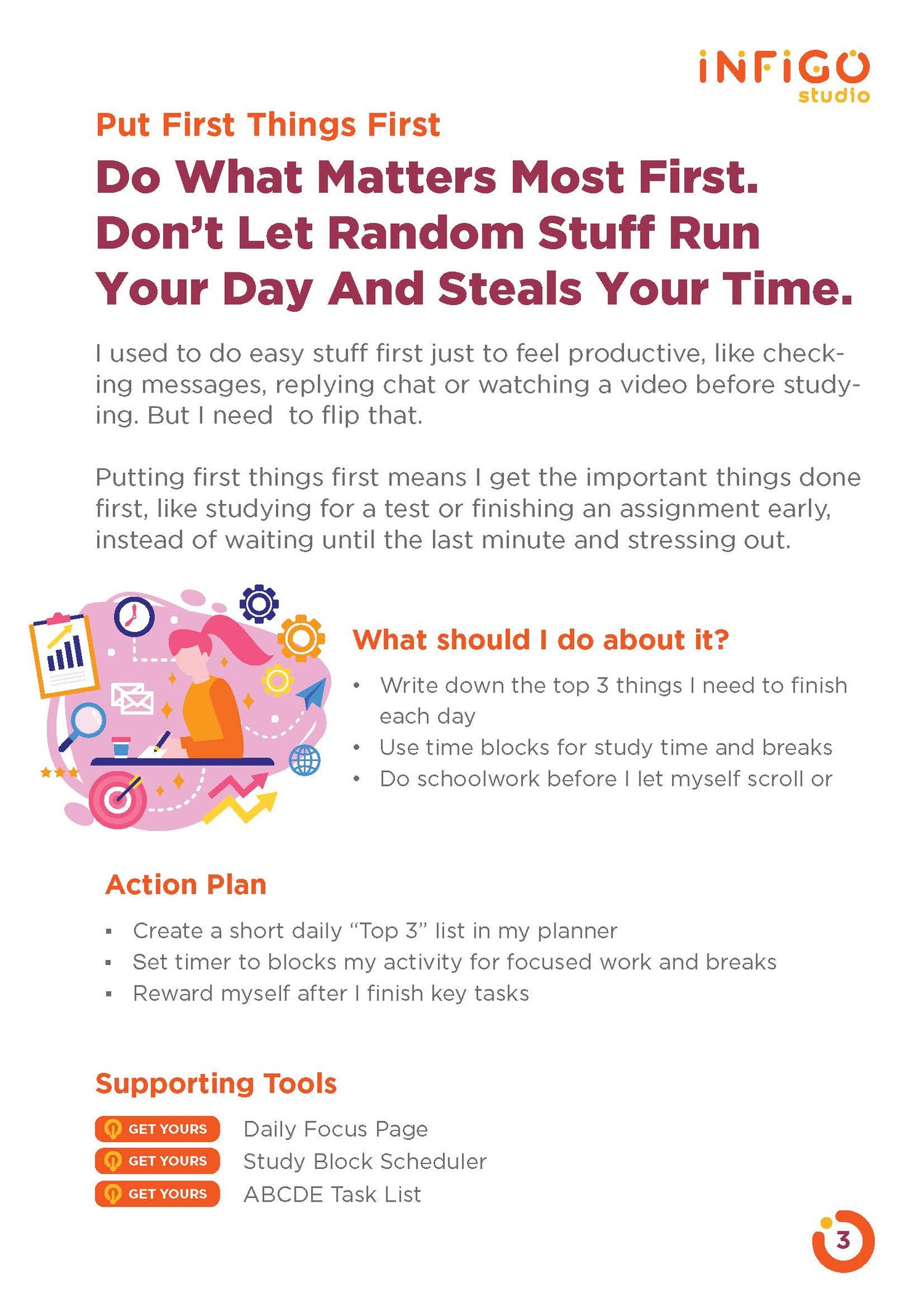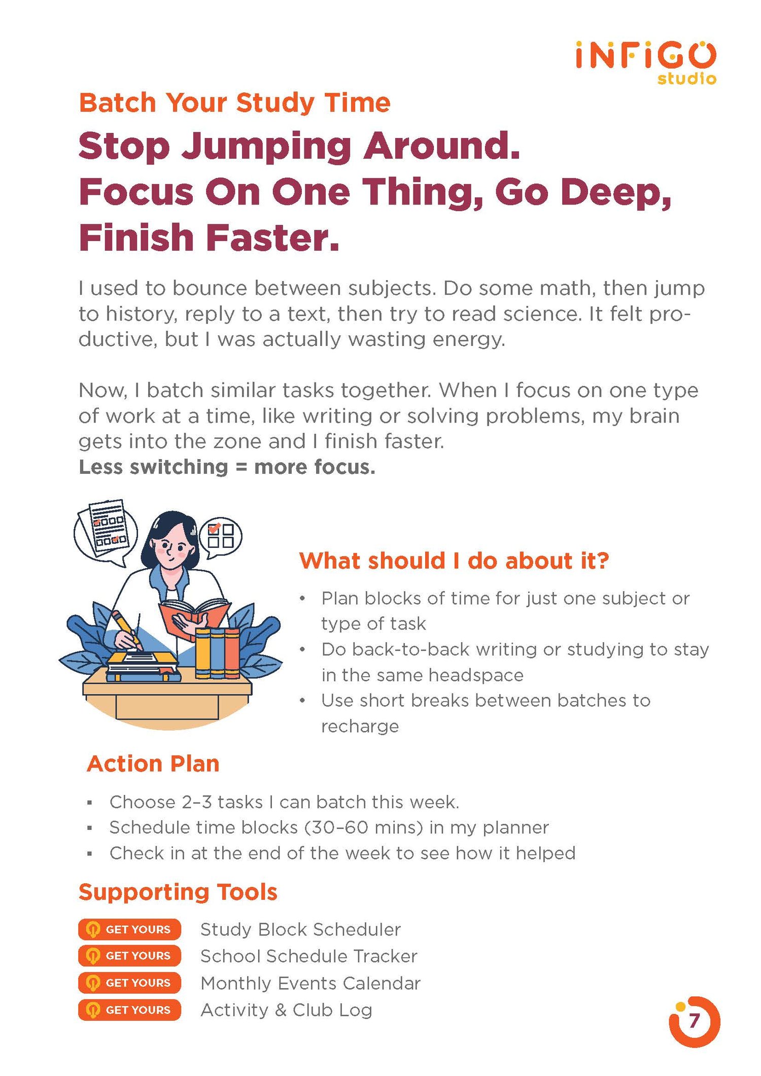- Actionable Tips – Easy-to-follow advice inspired by 7 Habits of Highly Effective Teens and Eat That Frog! for Students.