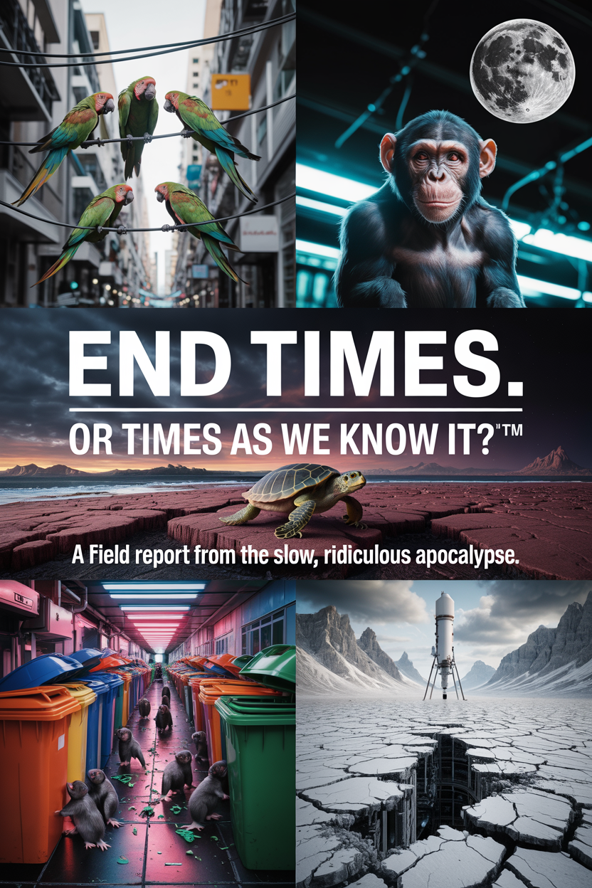 End Times. Or Times As We Know It?™ contextualizes contemporary dread by mapping six mundane “signs” — feral parrots, hyper-rational chimps, conservation rebounds, rats, melting villages, and lunar reactors — into a single coherent collapse cosmology. It dismantles both doom-porn and cheap optimism, compresses them into a darkly comic diagnostic that audiences can operationalize as daily behavior, institutional critique, and policy imagination. Designed as a synchronized book + docu-series + essay engine, it harnesses satire, reportage, and philosophy into a scalable franchise that can continuously absorb and codify new ‘signs’ as the era mutates.