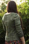 Sizes: 30 (34, 38, 42, 46, 50, 54, 58, 62)” / 76 (86.5, 96.5, 106.5, 117, 127, 137, 147.5, 157.5) cm finished bust circumference, intended to be worn with 0-4” of positive ease at the full bust. Shown in size 38” with zero ease at full bust.