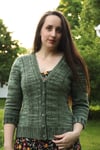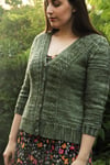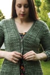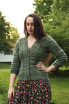 Silver Fir Cardigan features a fitted silhouette with set in sleeves and V neckline. Cables emerge from the sideways knit hems along the center front edges, and a larger cable panel accents the back. There are nine sizes offered, with finished bust measurements ranging from 30” to 62”. Choose a semi solid yarn with good stitch definition to show off your cables!