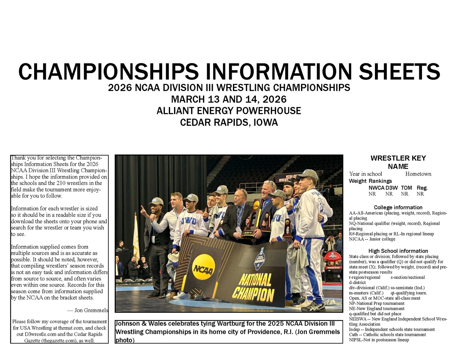 Thank you for selecting the Championships Information Sheets for the 2026 NCAA Division III Wrestling Championships. I hope the information provided on the schools and the 210 wrestlers in the field make the tournament more enjoyable for you to follow. Information for each wrestler is sized so it should be in a readable size if you download the sheets onto your phone and search for the wrestler or team you wish to see.