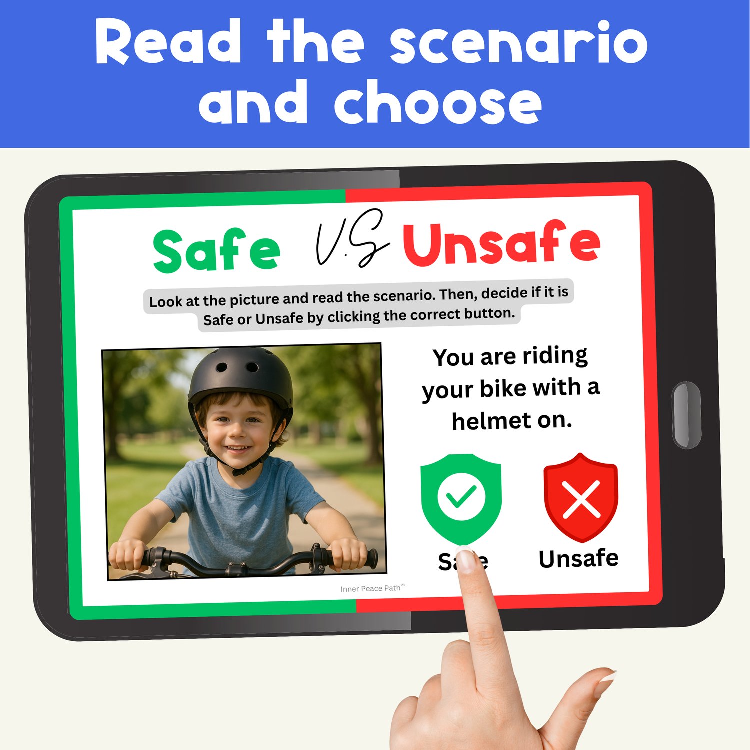 These interactive digital task cards help students learn how to recognize safe and unsafe choices in real-life situations.
