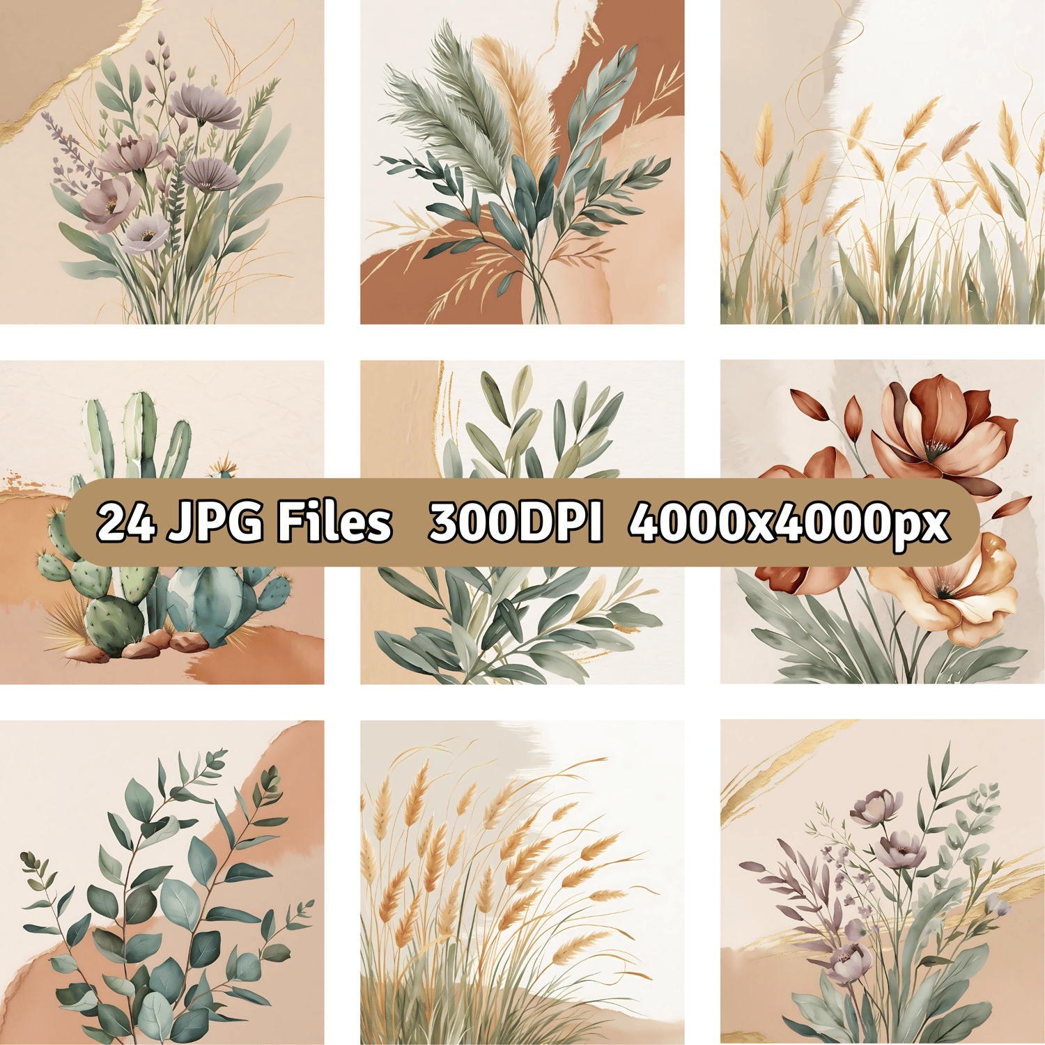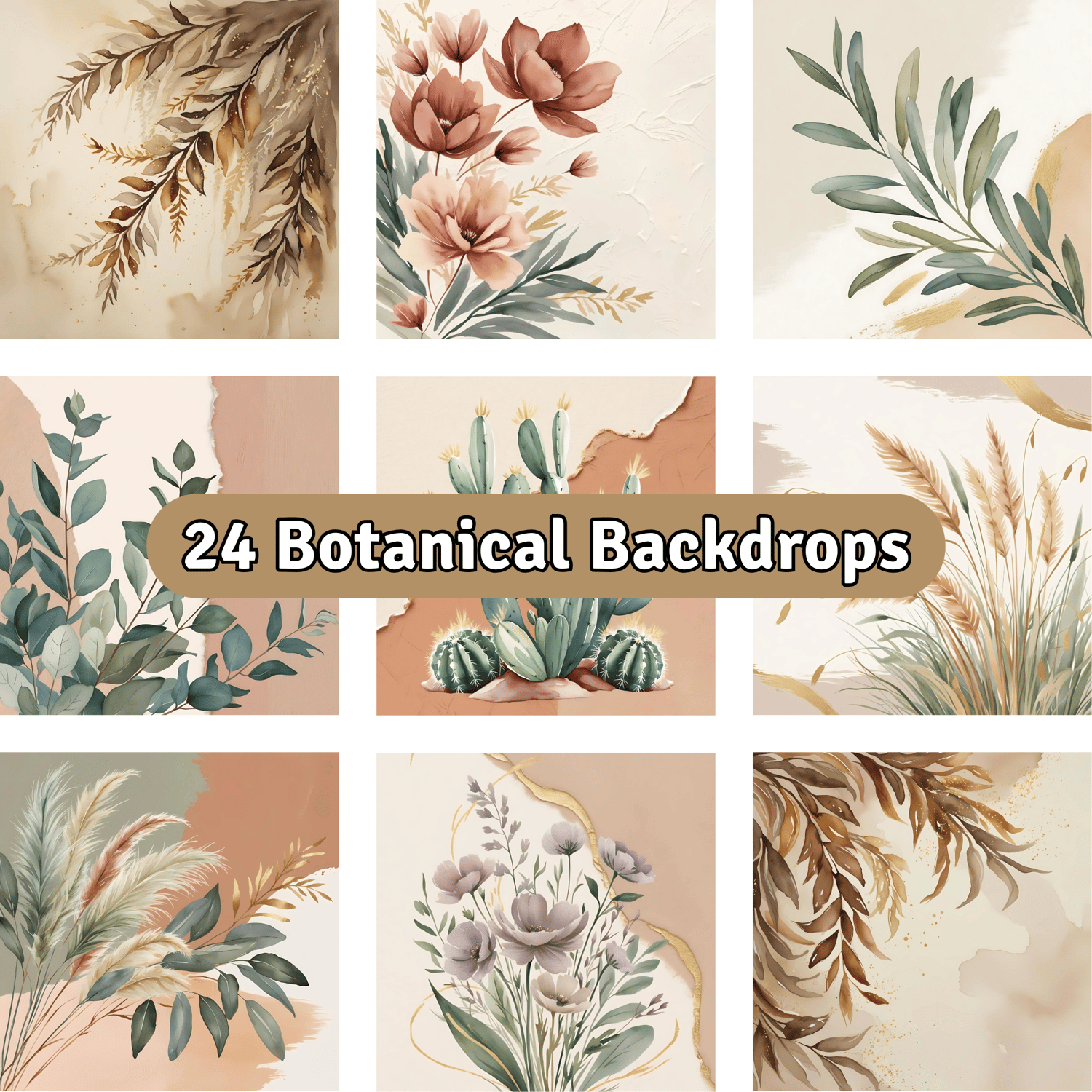 Elevate your creative projects with this set of 24 watercolor botanical backdrops, featuring earthy tones and delicate botanical elements such as olive branches, dried pampas grass, eucalyptus, wildflowers, cacti and more.