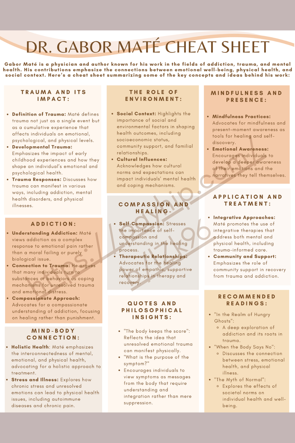 This cheat sheet highlights the work of Dr. Gabor Maté and his holistic approach to understanding the interplay between trauma, addiction, and health, advocating for compassion, understanding, and community support in the journey toward healing.