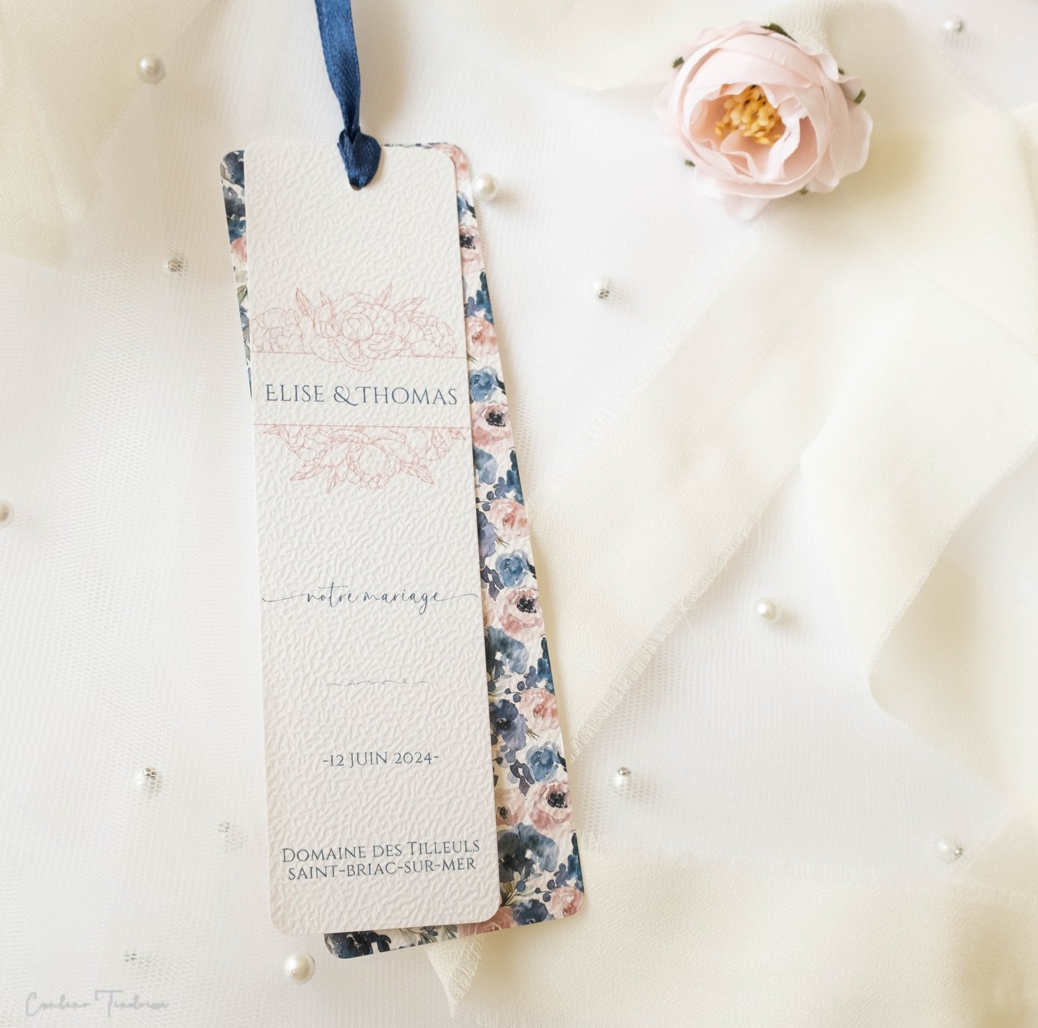 Chaque pièce (signets, menus, programmes, éventails) est ornée d’un motif aquarelle aux grandes fleurs dans des tons bleu marine et rose poudré.