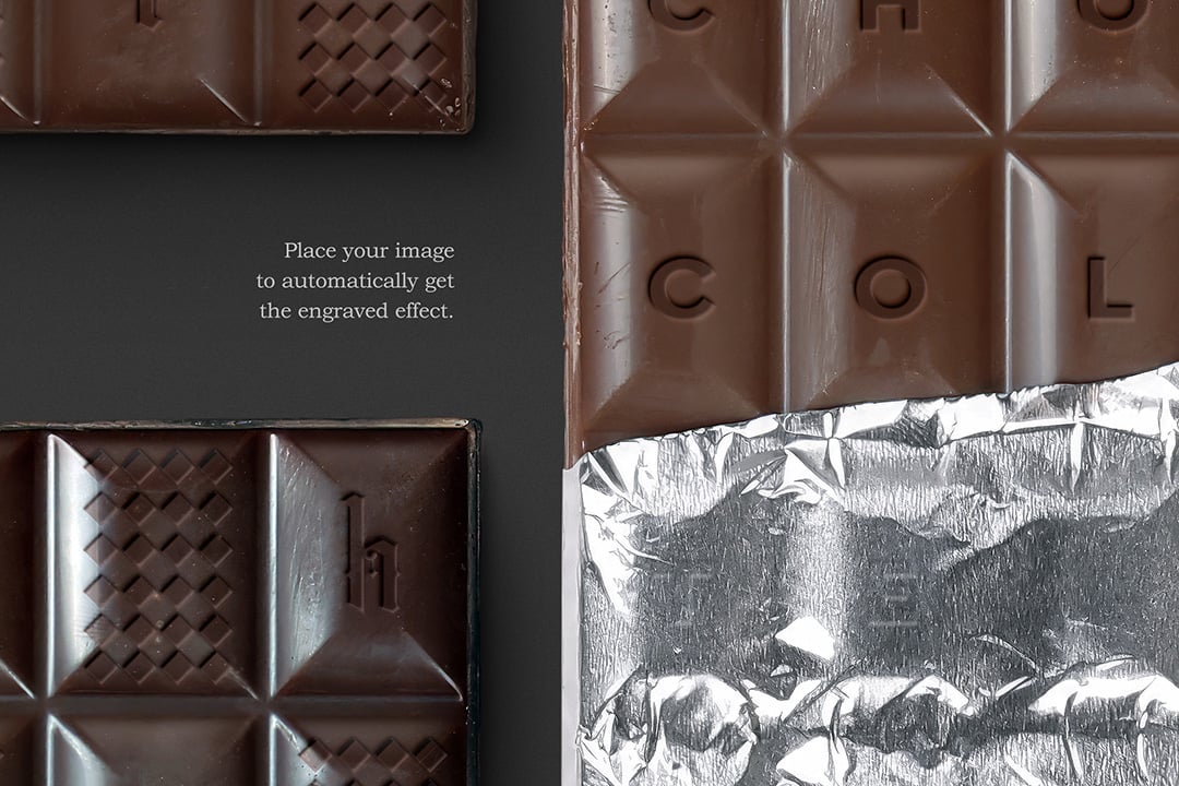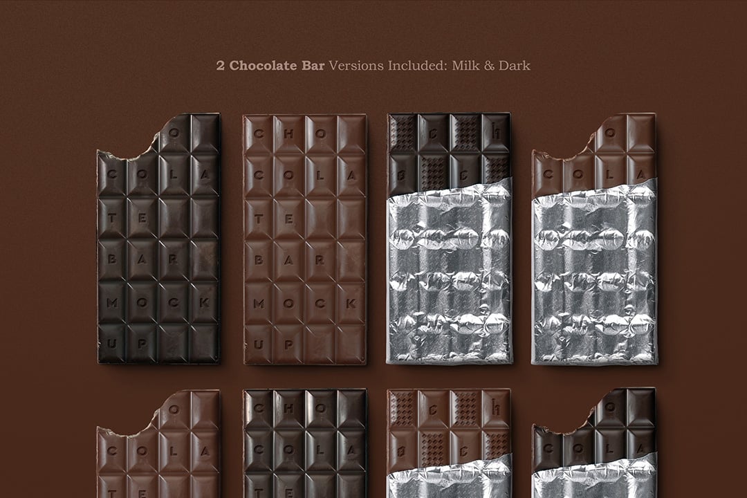 Photorealistic chocolate-bar mockup pack with milk & dark bars, bitten and foil-wrapped options, plus editable wrapper design.