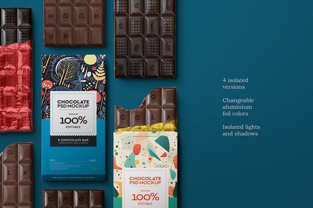 • 4 isolated chocolate-bar mockups (wrapped, unwrapped, half-wrapped, bitten)