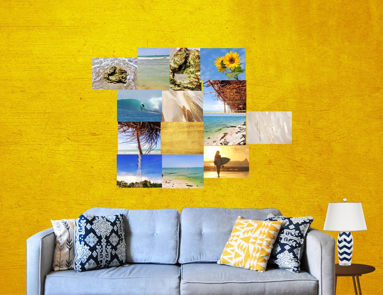 - DESIGN:The beach aesthetic wall collage kit includes a 48 set of 4x6 Inch photos & scrapbook paper. The collection has a beach theme with photography of the ocean, beach, surfers, and sunflowers.