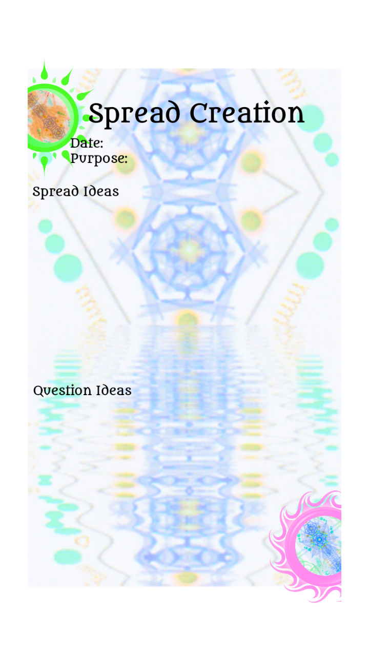 4. Spread creation page. This page come with the third eye chakra grid on it. This allows you to channel a higher energy into your spread creation. 2 other grids on it as well one for the highest third eye creativity and the other for the highest potential of the third eye.