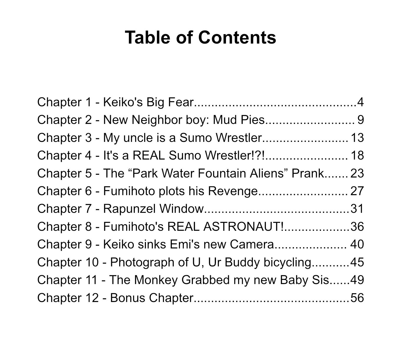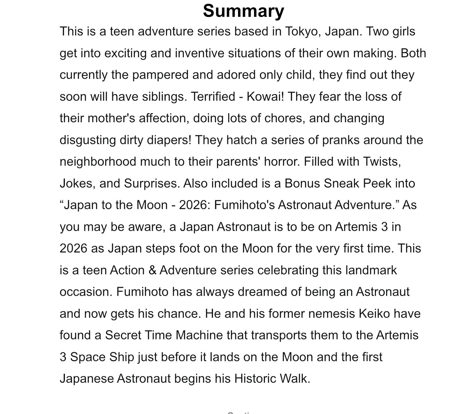 This is a teen adventure series based in Tokyo, Japan. Two girls get into exciting and inventive situations of their own making. Both currently the pampered and adored only child, they find out they soon will have siblings. Terrified - Kowai! They fear the loss of their mother's affection, doing lots of chores, and changing disgusting dirty diapers! They hatch a series of pranks around the neighborhood much to their parents' horror. Filled with Twists, Jokes, and Surprises. Also included is a Bonus Sneak Peek into “Japan to the Moon - 2026: Fumihoto's Astronaut Adventure.” As you may be aware, a Japan Astronaut is to be on Artemis 3 in 2026 as Japan steps foot on the Moon for the very first time. This is a teen Action & Adventure series celebrating this landmark occasion. Fumihoto has always dreamed of being an Astronaut and now gets his chance. He and his former nemesis Keiko have found a Secret Time Machine that transports them to the Artemis 3 Space Ship just before it lands on the Moon and the first Japanese Astronaut begins his Historic Walk.