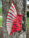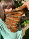 The texture of the laceweight mohair short rows creates dimensional stripes that remind me of an animal’s exoskeleton. The contrast of color and texture creates bold curved stripes in this cowl. The resulting lightweight yet warm cowl envelops the wearer in a protective knit shell.