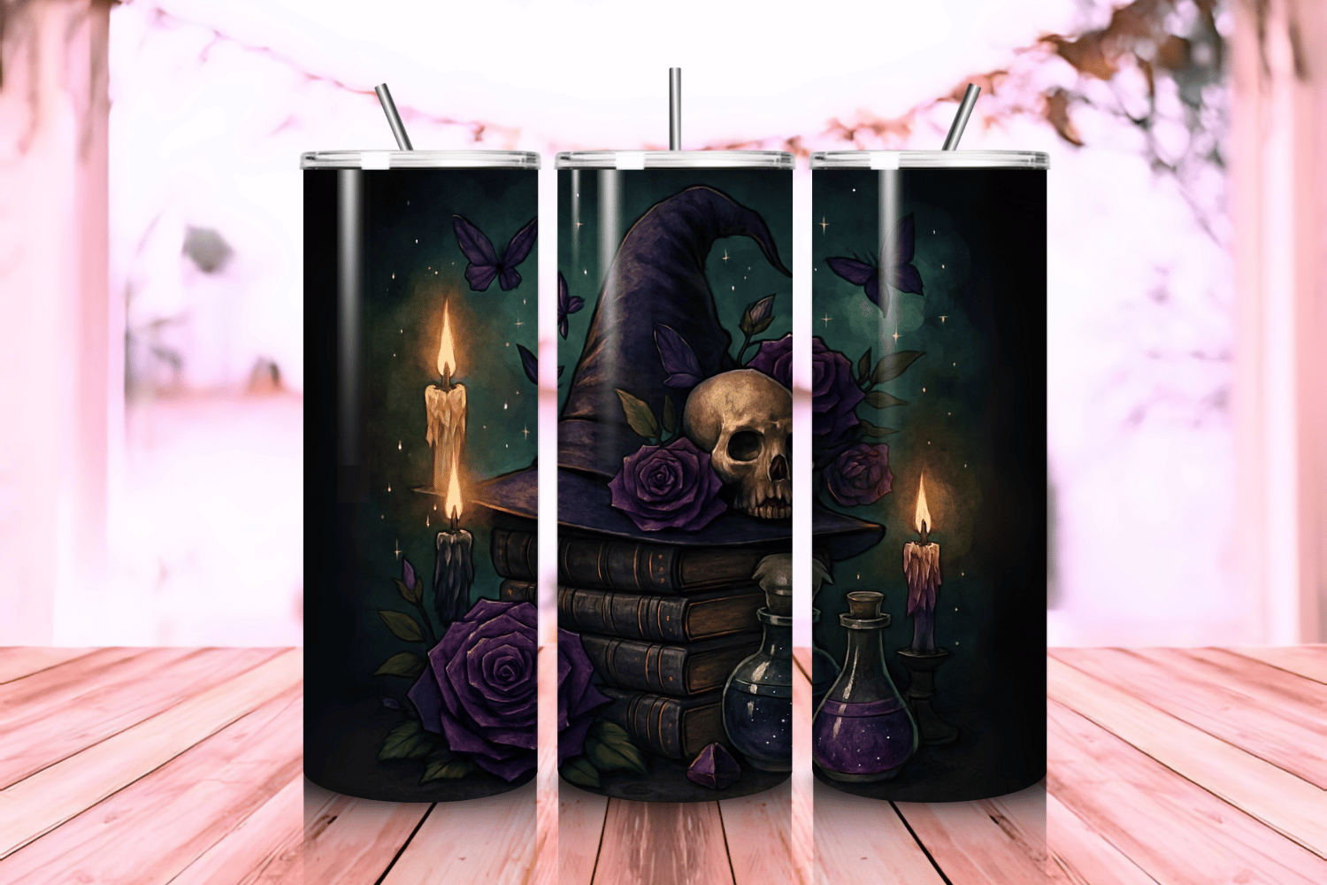Witch Books Flowers Tumbler Wrap PNG – 20oz Skinny Sublimation Design with Magical Witchy Books & Floral Illustrations – 300 DPI Instant Digital Download