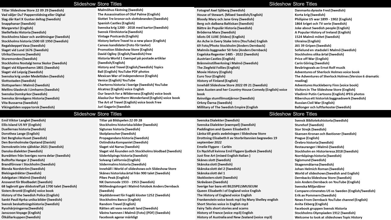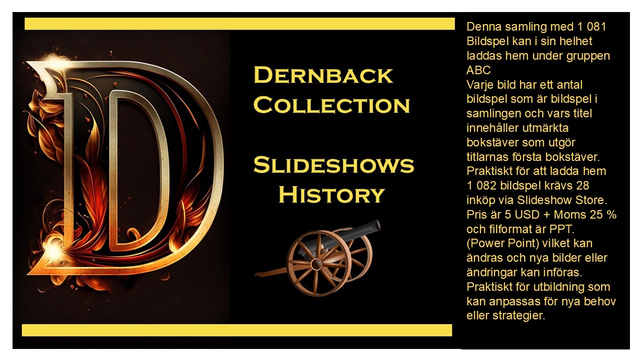 Pris är 5 USD + Moms 25 % och filformat är PPT. (Power Point) vilket kan ändras och nya bilder eller ändringar kan införas. Praktiskt för utbildning som kan anpassas för nya behov eller strategier. Klicka på länken för att ladda hem bildspel med olika bokstäver A till Ö som första bokstav i en given titel. Vill man bara ladda hem titlar som börjar med A går det bra. Vill man bara ladda hem ett bildspel och har titeln, skriv in i butikens sökruta och ladda hem från butiken. Samma pris 5 USD + Moms 25 %. Den totala samlingen har utökats med flera tusen nya bildspel under åren 2022 till 2026.