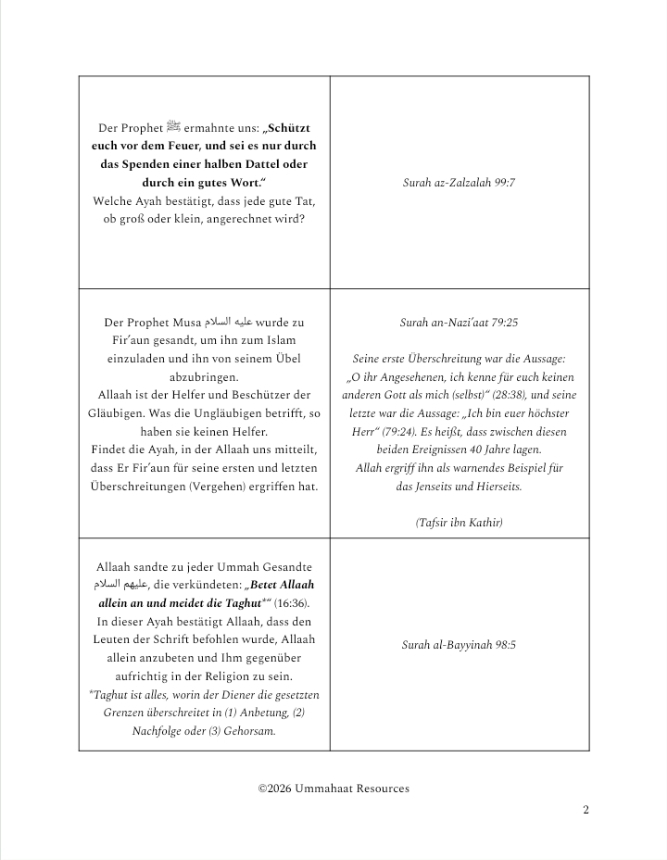 Zieht jeden Tag gemeinsam eine Karte und findet die Ayaat. Besprecht den Tafsir oder lest die dazugehörige Geschichte.