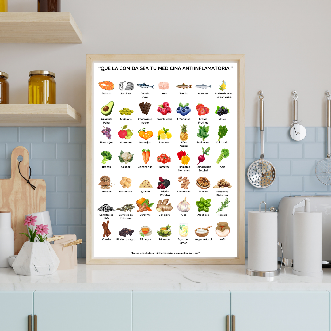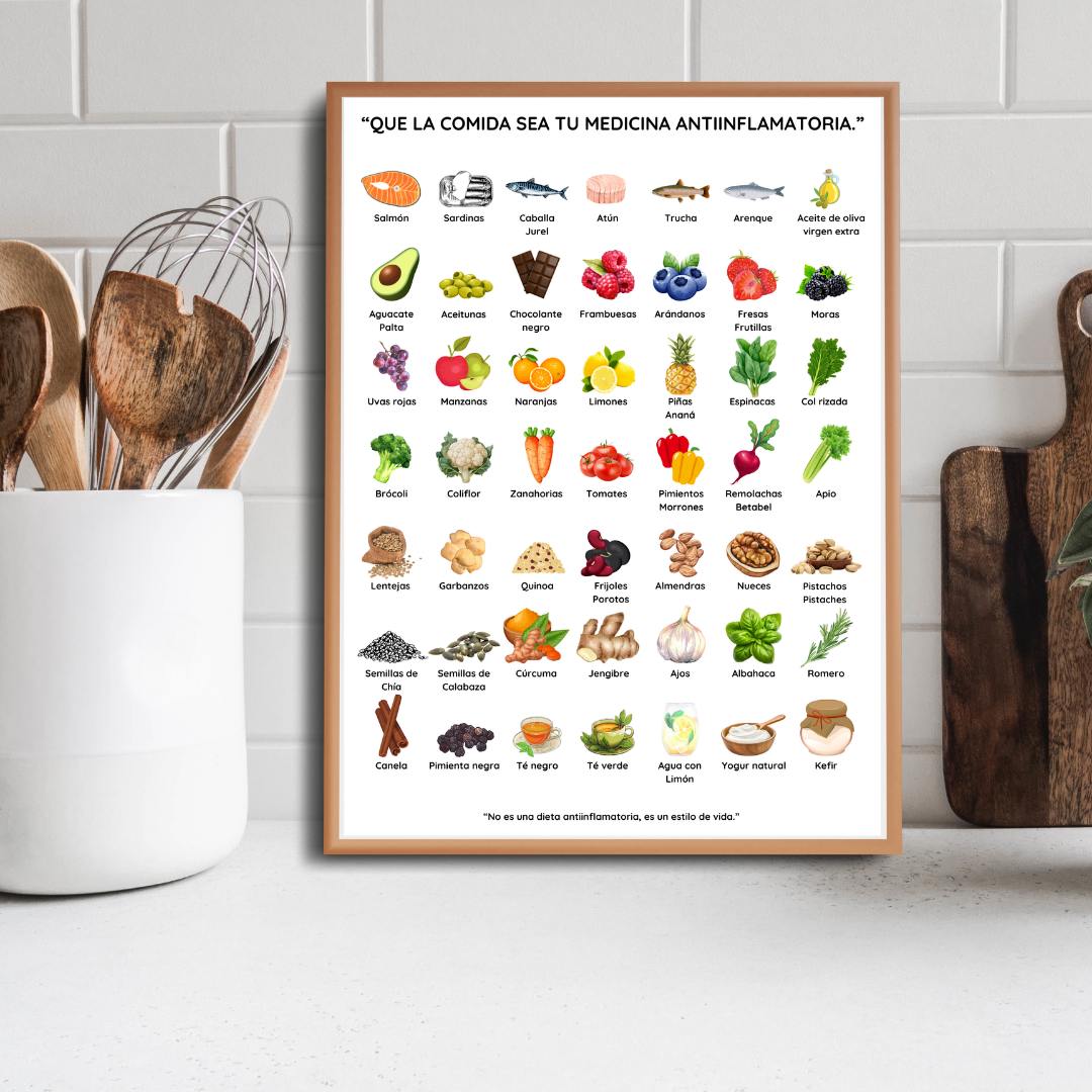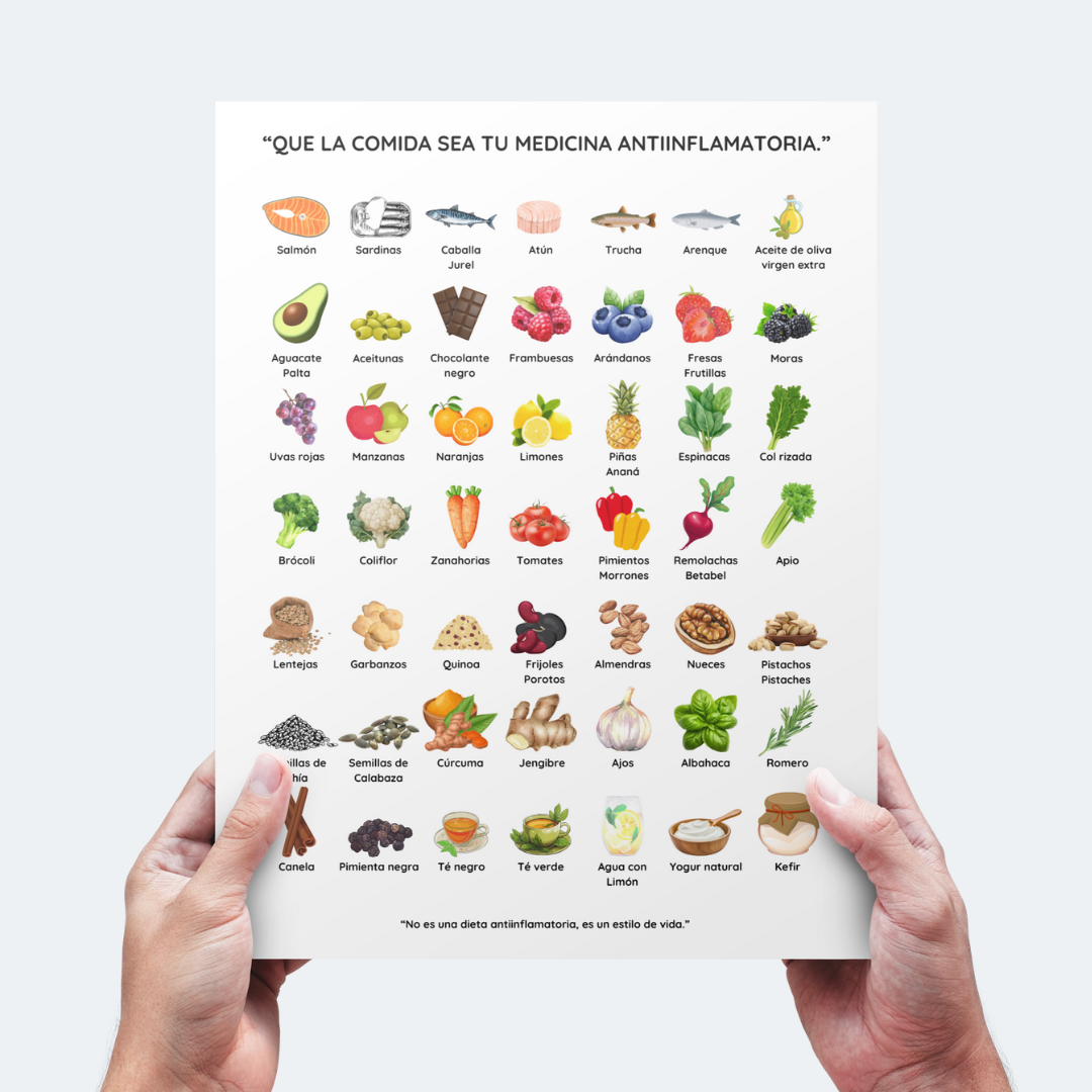 Lista de Alimentos Antiinflamatorios (Español), lista de alimentos para reducir la inflamación, tabla de alimentos imprimible PDF y PNG