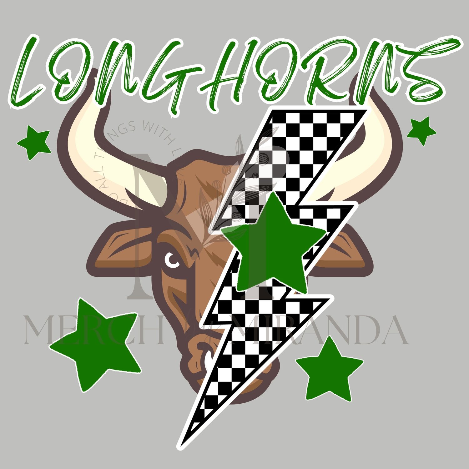 Longhorn Mascot Green | Sublimation Design | Digital Download | School Spirit Shirt PNG | DTF Design | Lightning Bolt-Checkered with Stars - Longhorns