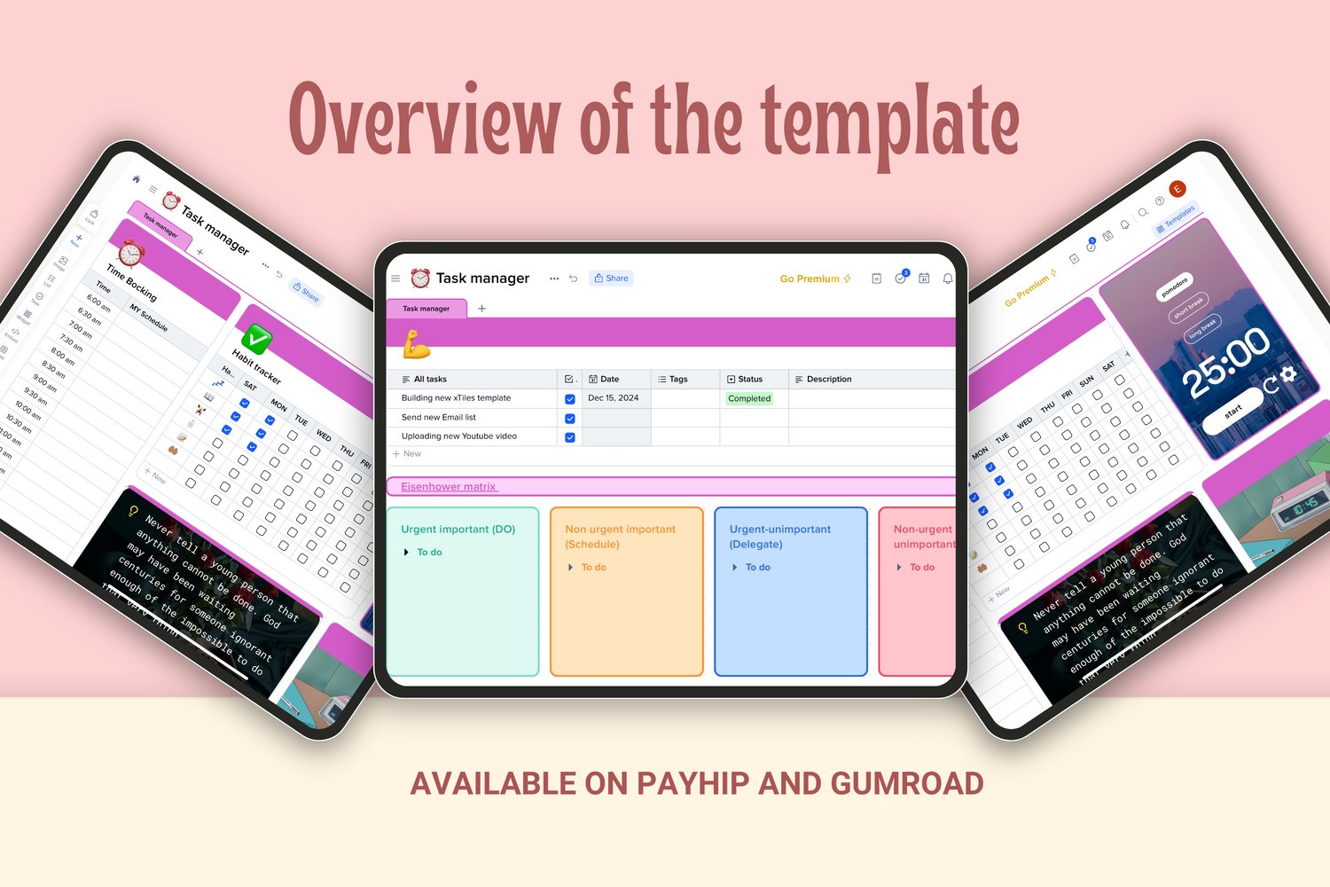 - Comprehensive Features: Includes important tasks, Eisenhower matrix, time blocking, habit tracker, Pomodoro timer widget, quotes generator widget, and clock widget—all in one place.