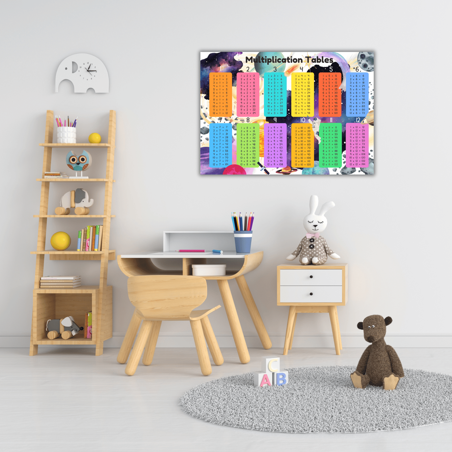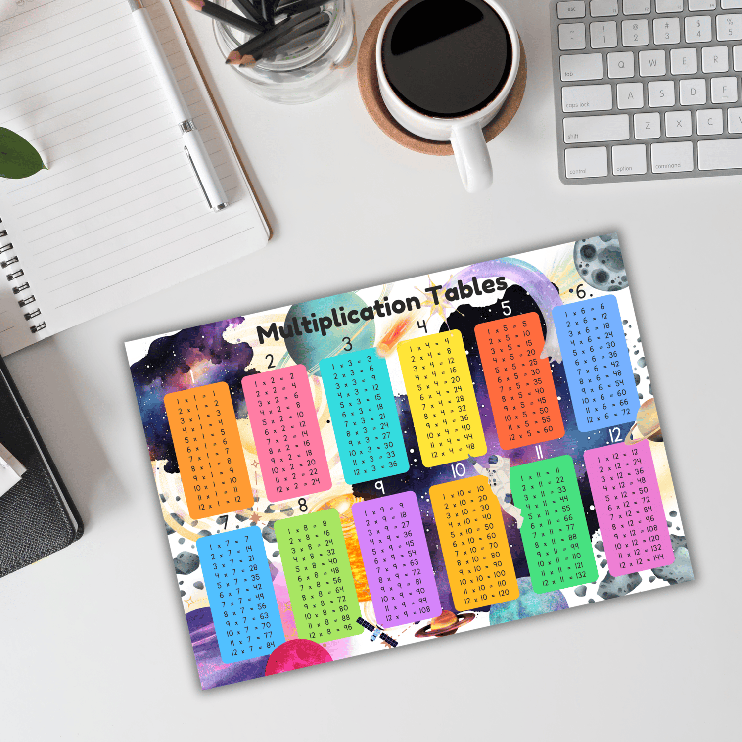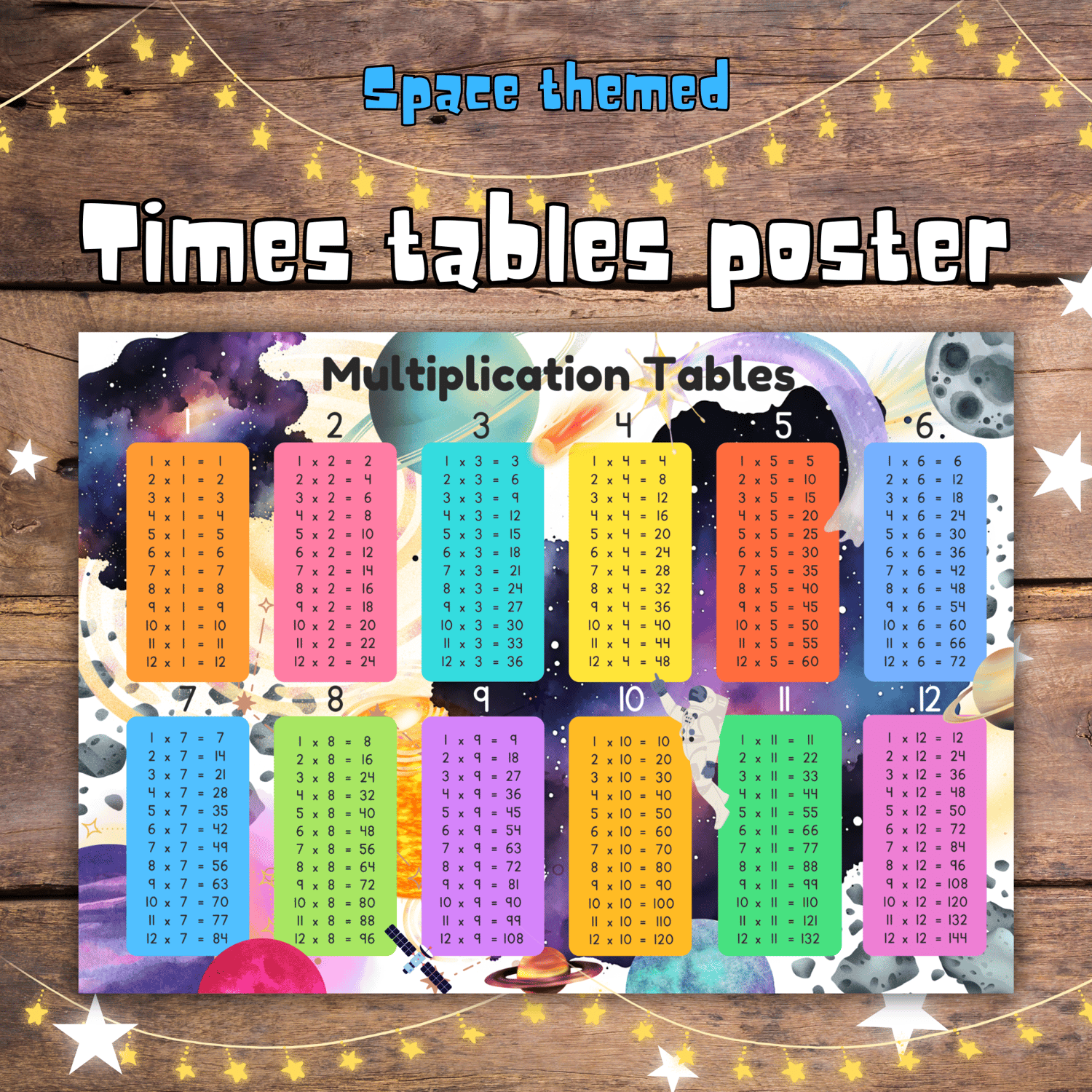 With all the times tables 1 - 12. Make learning fun, with this colourful spaced themed poster!