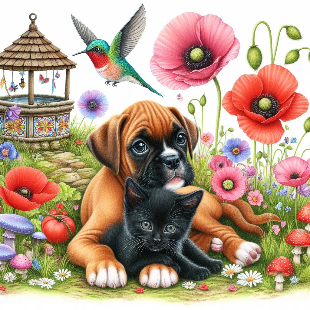 A boxer puppy and black kitten with a wishing well, poppies & humming birds.