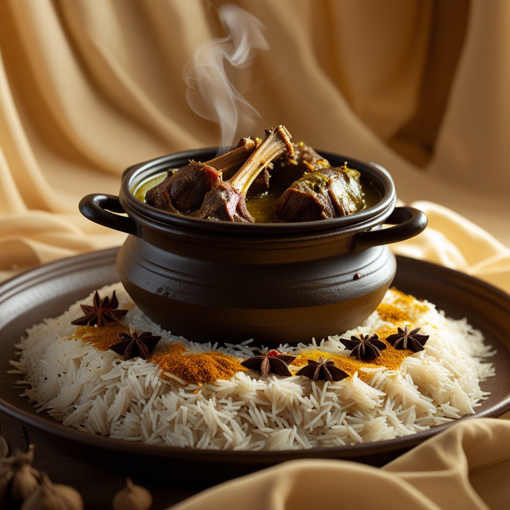 A warm and inviting professional food photography setup featuring Dum Pukht, a slow-cooked lamb dish, presented in a sealed earthen pot, placed atop a bed of aromatic saffron-infused rice, garnished with whole cardamom, star anise, and cloves, against a soft, creamy background that evokes a sense of comfort and luxury, with a hint of warm steam rising from the dish, bathed in warm, golden indoor light, emphasizing the rich flavors and aromas of the traditional Indian cuisine, with a shallow depth of field, blurring the surrounding elements, and drawing the viewer's attention to the tender, slow-cooked lamb, and the delicate arrangement of spices on the rice.