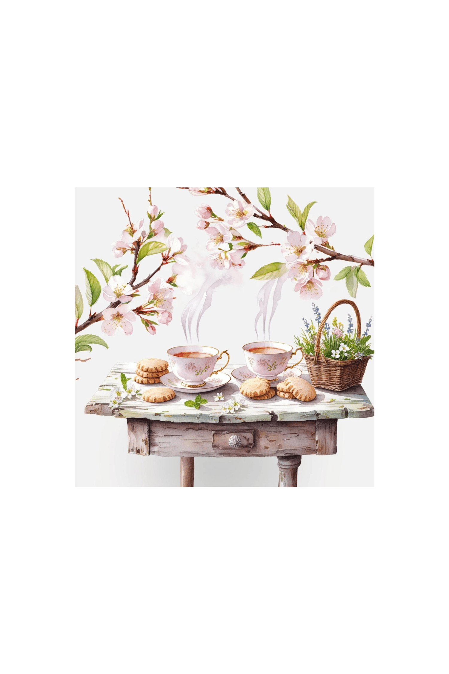 ✔️ Background and corner feature a beautiful watercolor tea scene