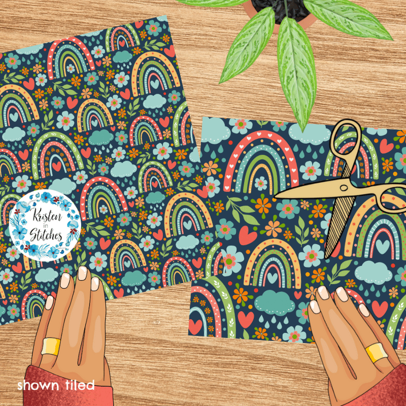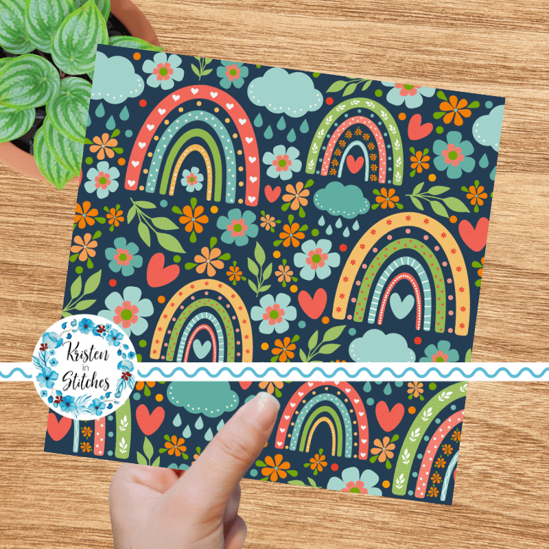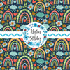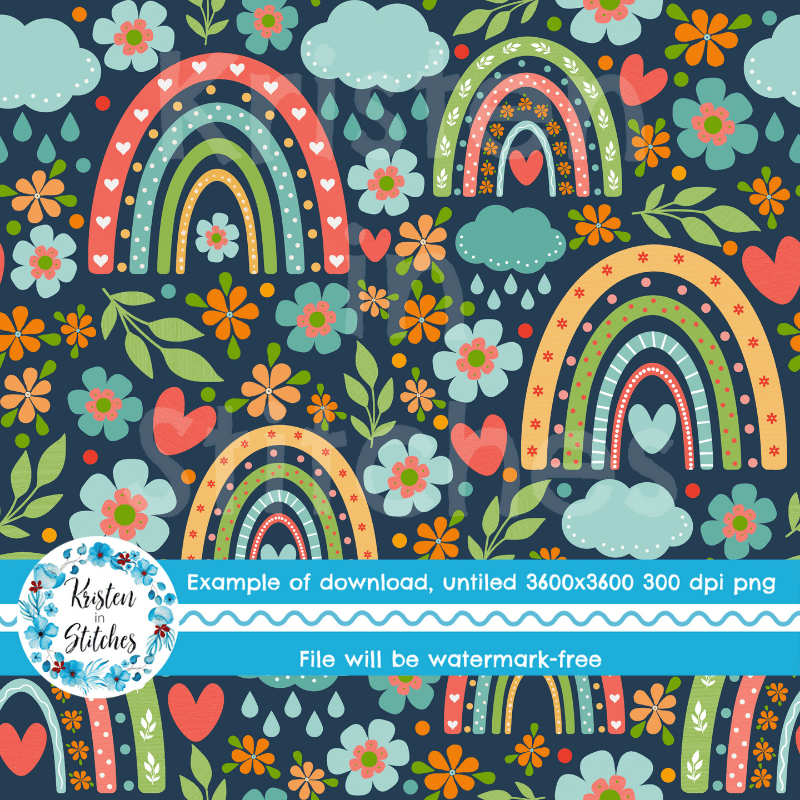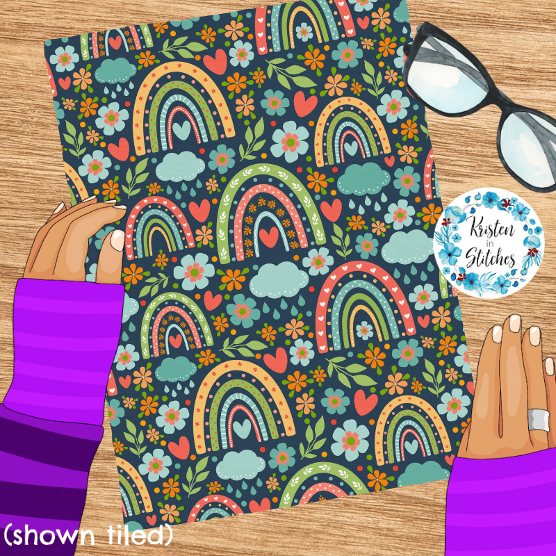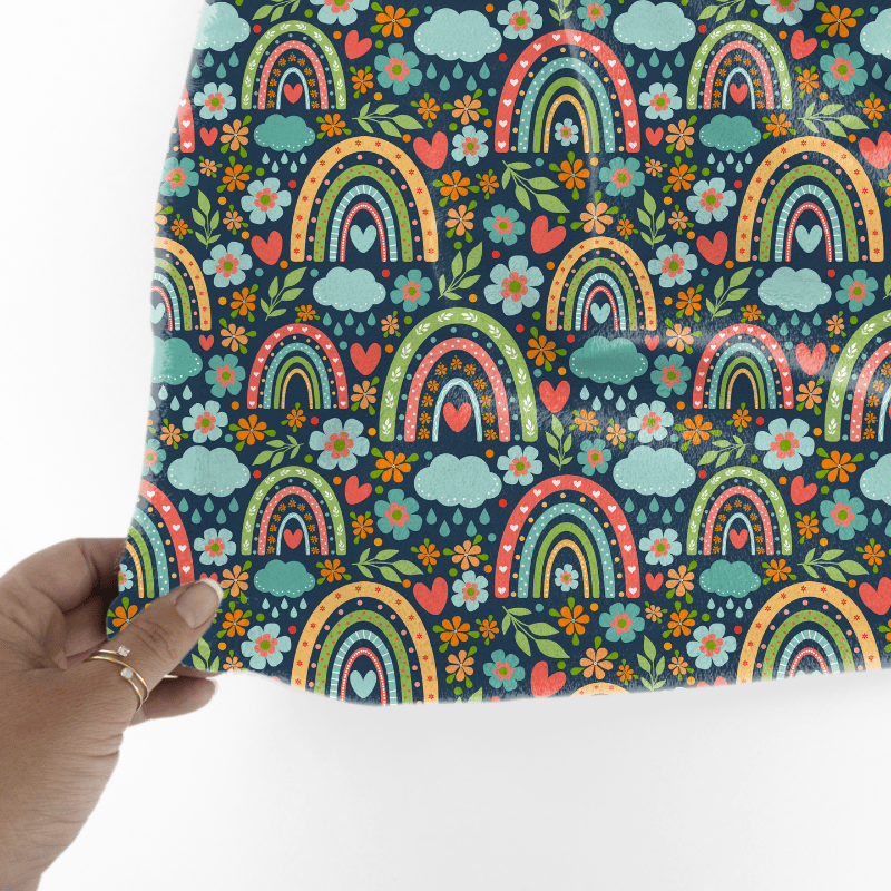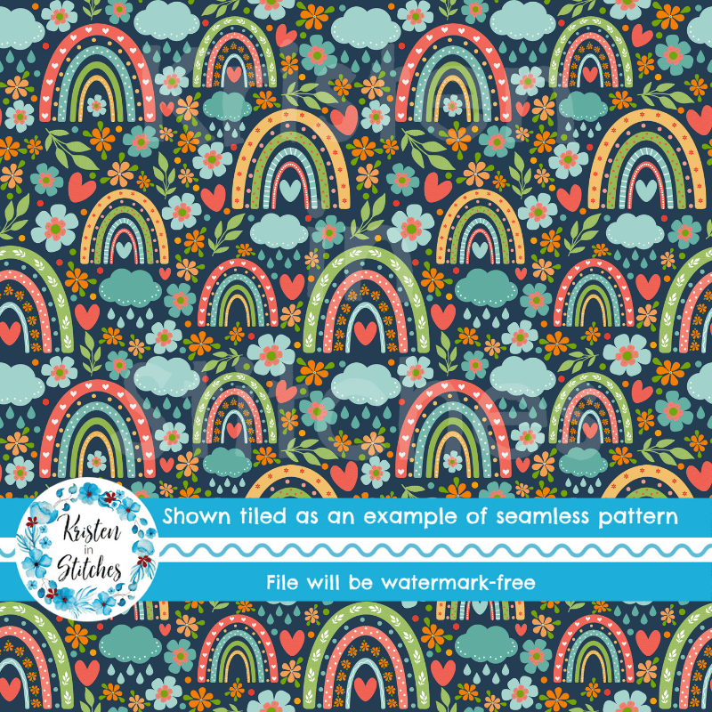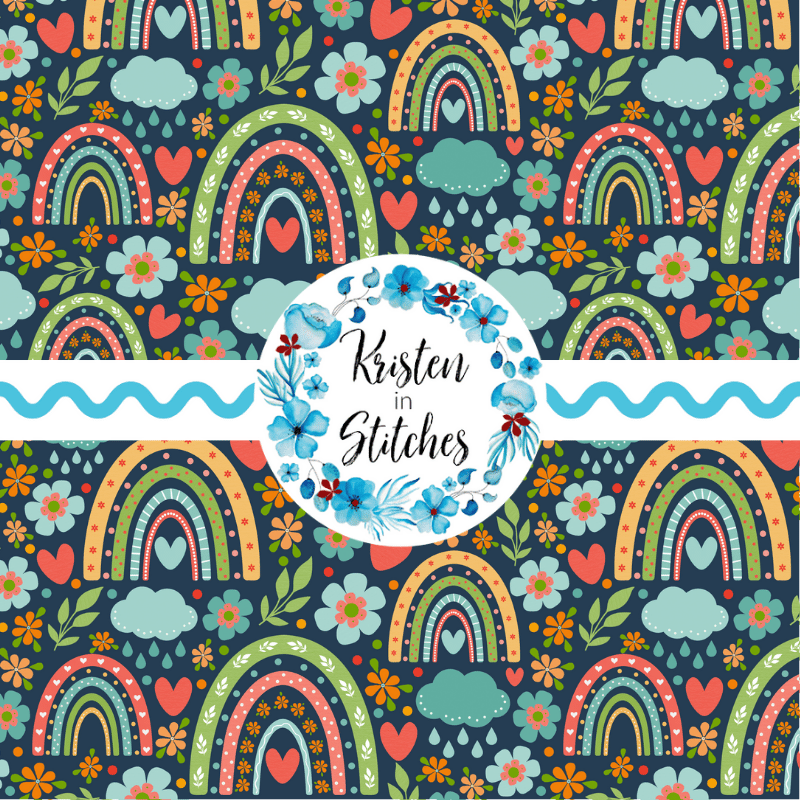 Boho rainbows, rain clouds, hearts and flowers on navy.