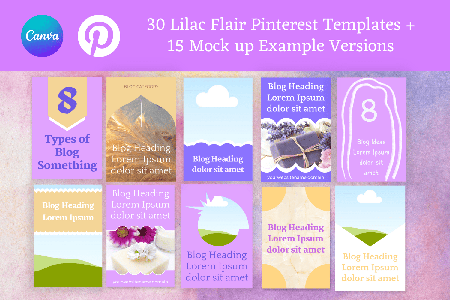 30 Lilac Flair Canva Pinterest Pin Templates + Mock Up Examples